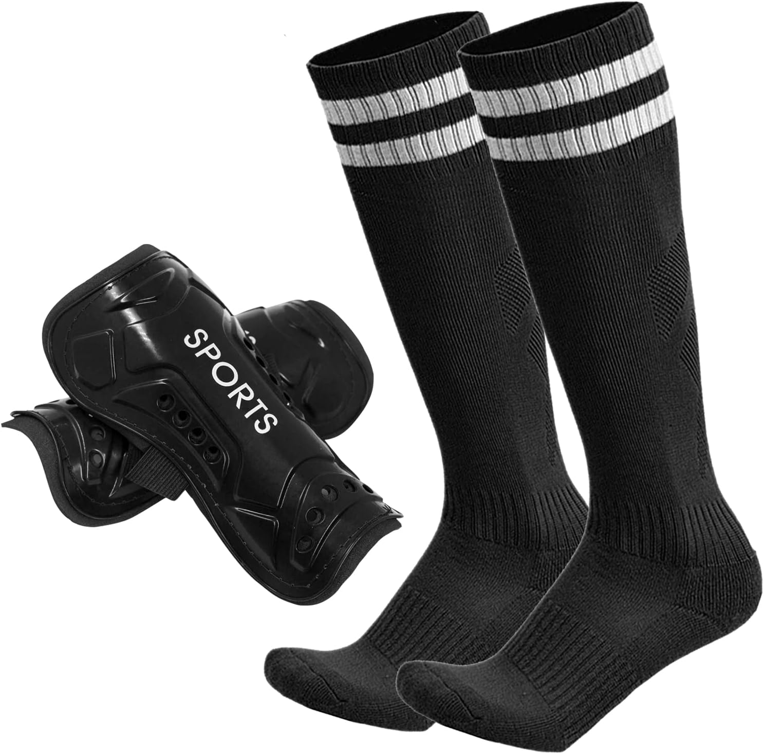 【High Comfort & Great Elasticity】- The powerful soccer training Shin Guards are created with high strength PP shell which helps reducing impact on leg bones and muscle effectively; EVA backing and multiple breather holes design for high comfort and high breathability. The Soccer Socks made by 95% cotton and 5% natural latex rubber, good elasticity for improved fit.