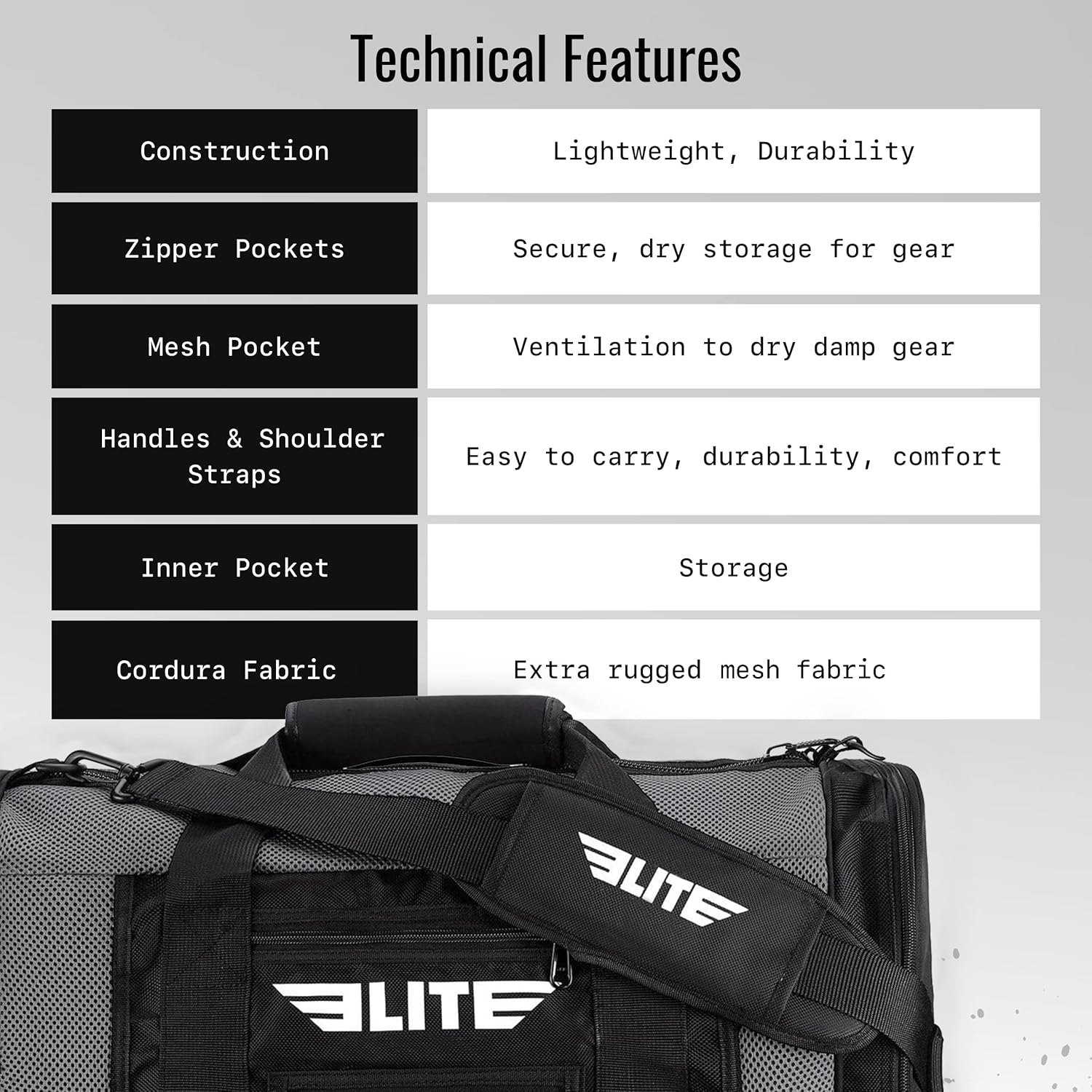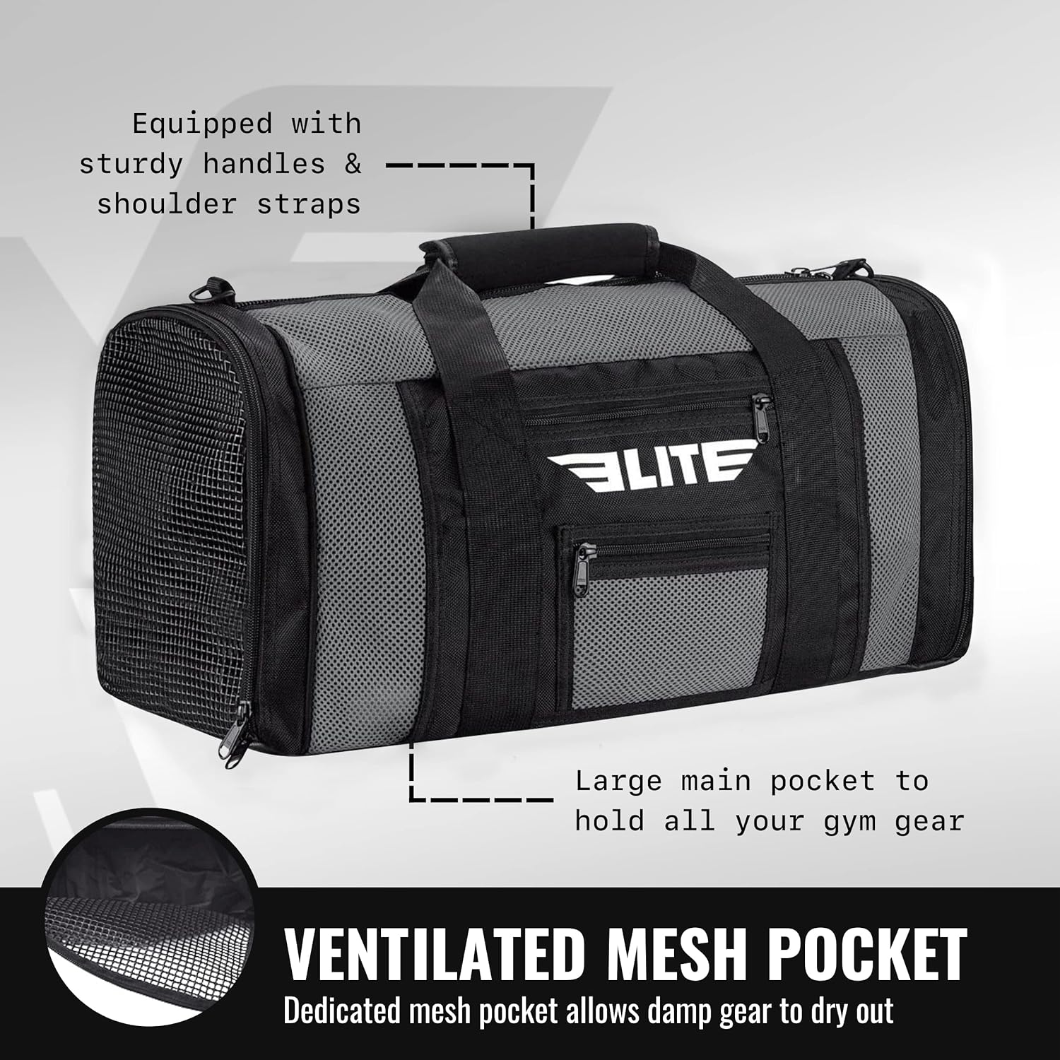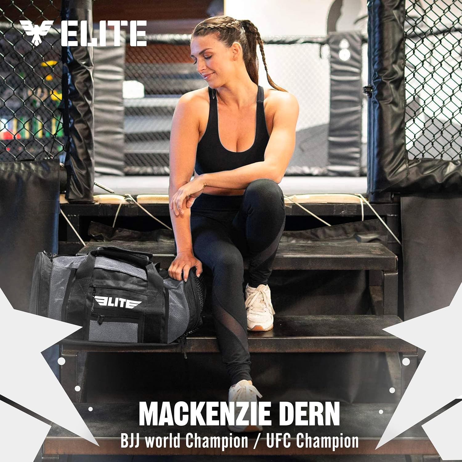 Convenient Storage: Elite Sports gym duffel bag for boxing, MMA, BJJ gear is big enough to keep your gym gear and equipment and more conveniently. The gym bag shoes compartment is dedicated to shoes; other dedicated pockets are also available