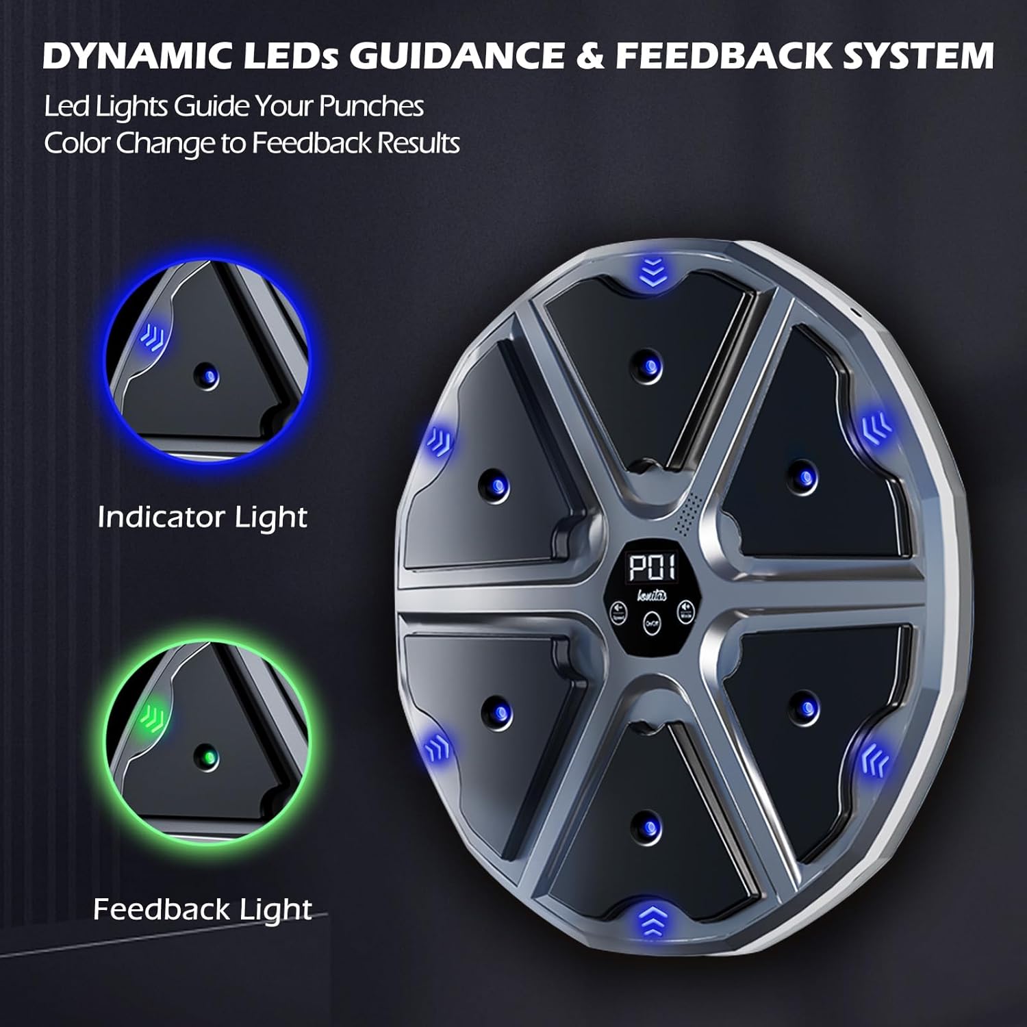 Innovative Boxing Equipment for Home: Our Smart Music Boxing Training Machine features 6 punching pads, each equipped with central and peripheral LED lights. The LEDs can flash in sync with the built-in or Bluetooth-connected music, indicating the target pad. Correct hits change the LED color and play a sound effect, while incorrect hits trigger a different sound.