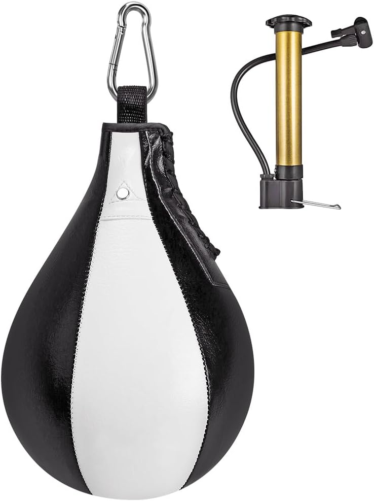 Premium Leather Punching Bag – The speed bag is made of high-quality leather that is durable, smooth and easy to inflate or deflate. It swings evenly when hit and does not wobble or bounce unpredictably. It also resists wear and tear and is easy to clean.