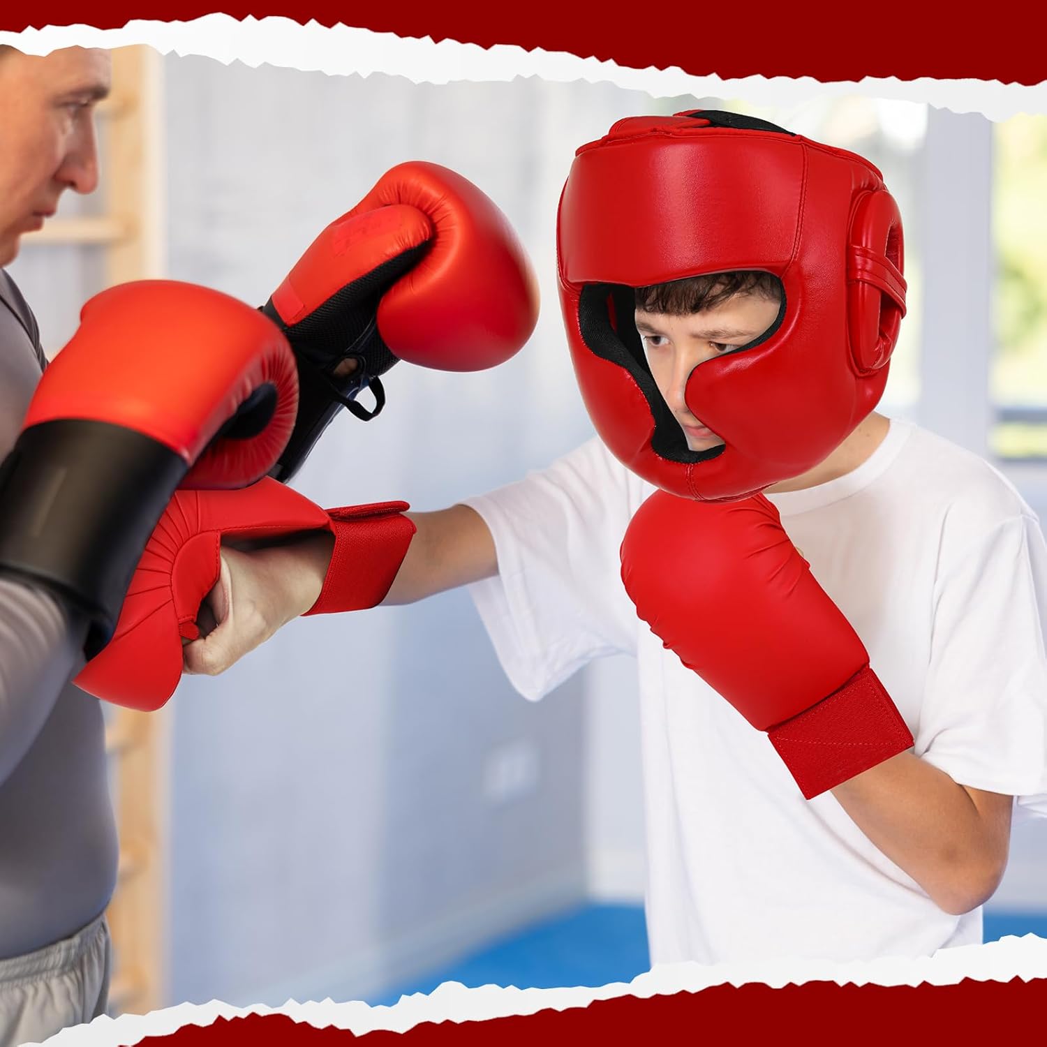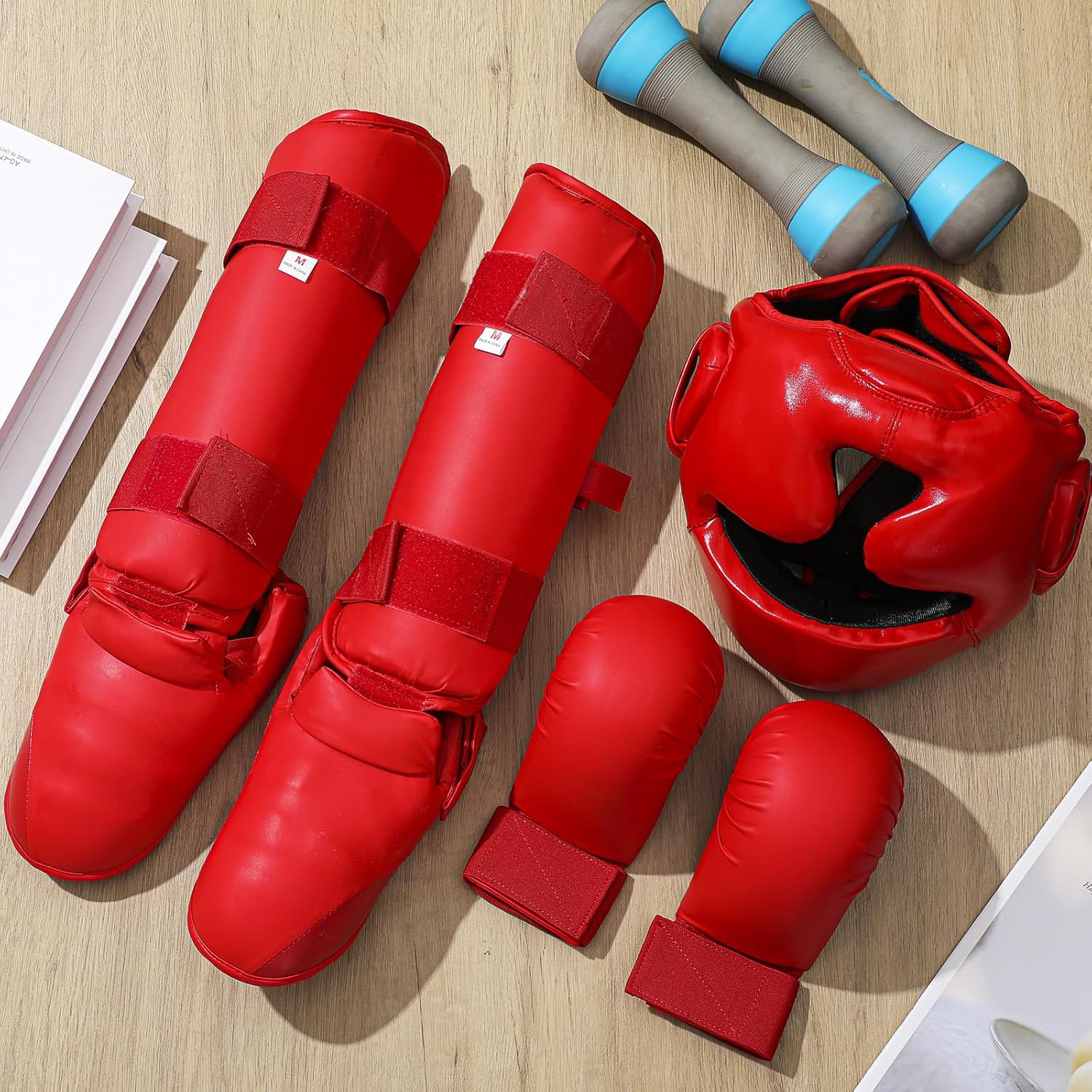5 Pcs Red Sparring Gear Set 1 Pcs Boxing Headgear Safety Helmet 2 Pcs Karate Gloves 2 Pcs Karate Shin Guards and Karate Shoes Boxing Gear Equipment for Beginner Kid Adult Protective Training