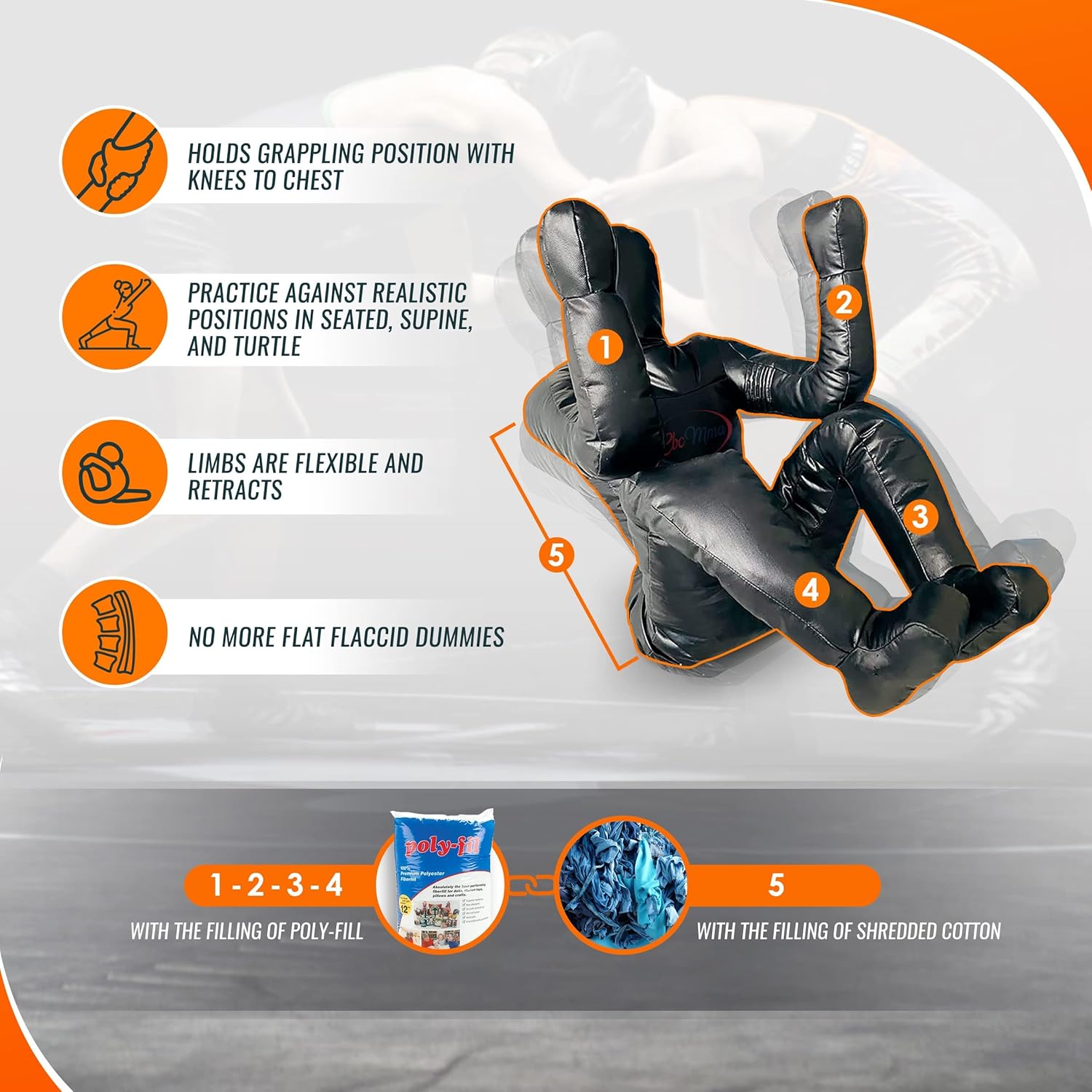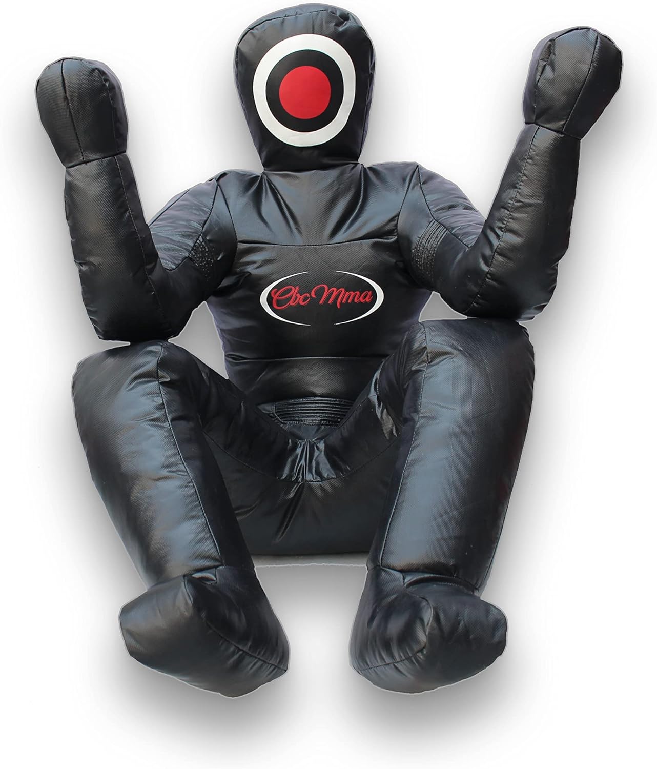 Tired of your dummy lying flat? CBC MMA brings you the most versatile grappling dummy in the market. Our innovative design makes the dummy look and act realistic when drilling. The dummy simply holds its position, hunched back, with bent knees to chest, and bent elbows. Don’t drill on a dummy that looks and acts like a dead body. So you know what to do! Put on your smarty pants and get this grappling dummy! How to Fill | Filling Instructions 1) Recommended Material: 50 lbs of fabric (used clothing or bed sheets) 2 lbs of polly-fill (aka polyester filling) 2) Estimated Time: 60 ~ 75 minutes 3) General Instructions – fill in the extremities (feet/ankle/shin/hand/wrist/forearm) with poly-fill, and the rest with tightly packed fabric. This method helps the dummy hold its position. – fill both materials as tightly as possible. – for lower extremities fill in feet,ankle, and halfway point of shin with poly-fill – you want knees tightly packed with fabric so that it holds the 90 degree angle – IMPORTANT fill the joints (elbows and knees and shoulders) VERY TIGHTLY PACKED with fabric so that it holds the 90 degree angle – hips/butt/crotch must be filled TIGHTLY with fabric to make it support the leg and hold the position – neck and head should be filled tightly with no empty spots 4) Tips – trick is to really pack it tightly; really compact the fabric as much as possible (push/pull/hit/massage it in) – hip and shoulder are tough – really get in between and stuff it as much as possible – body/torso: you can be more liberal with how you fill – when you finish, throw the dummy around, hit it, step on it, or smash it, to compress the fabric a bit more; over time you can stuff it more as needed. – if you do it right, it should be tough to close the zipper