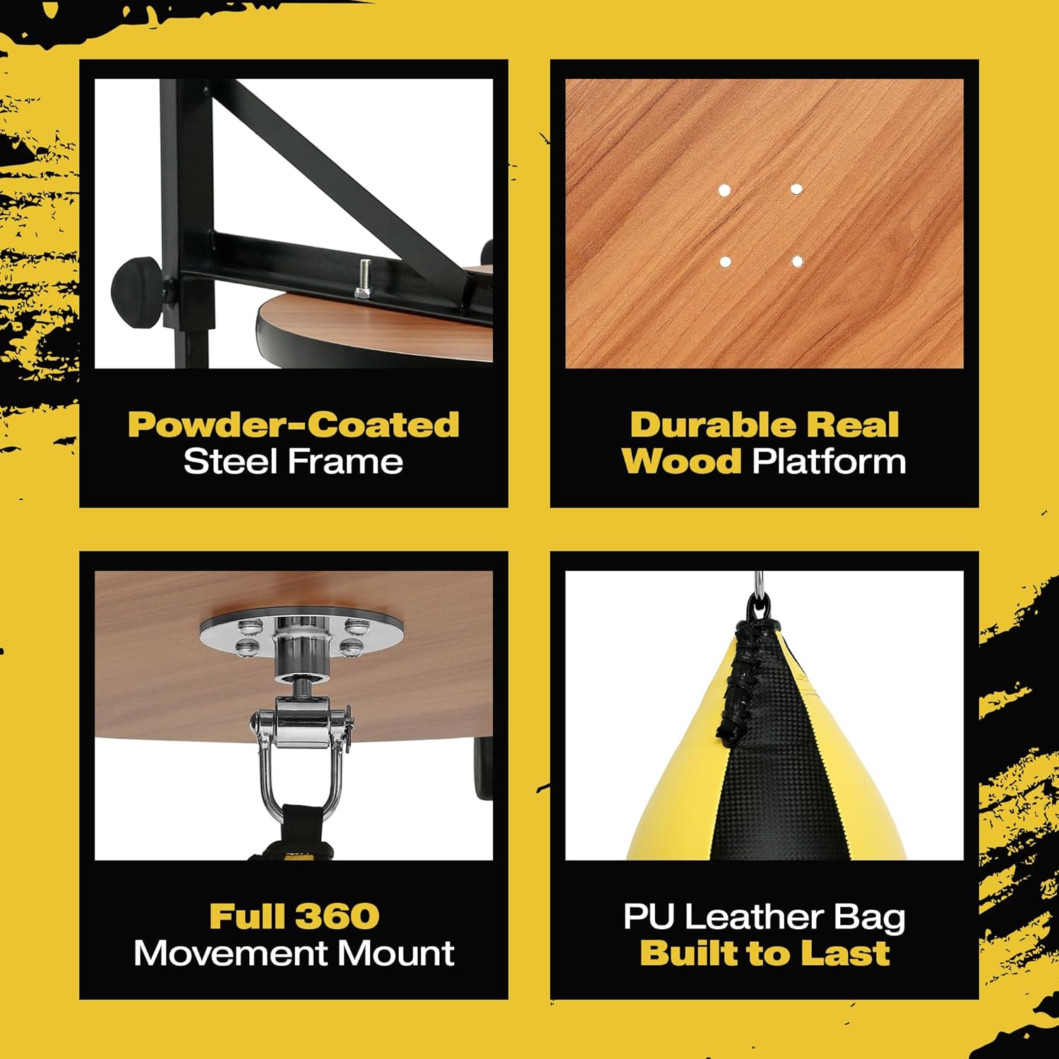 HEAVY DUTY DESIGN – Our heavy-duty speed bag platform features two sturdy brace boards for secure wall mounting, along with all-metal railings and a 23” diameter wood platform to ensure maximum stability during rigorous workouts. The punching bag is made of synthetic leather for enduring durabily and longevity.