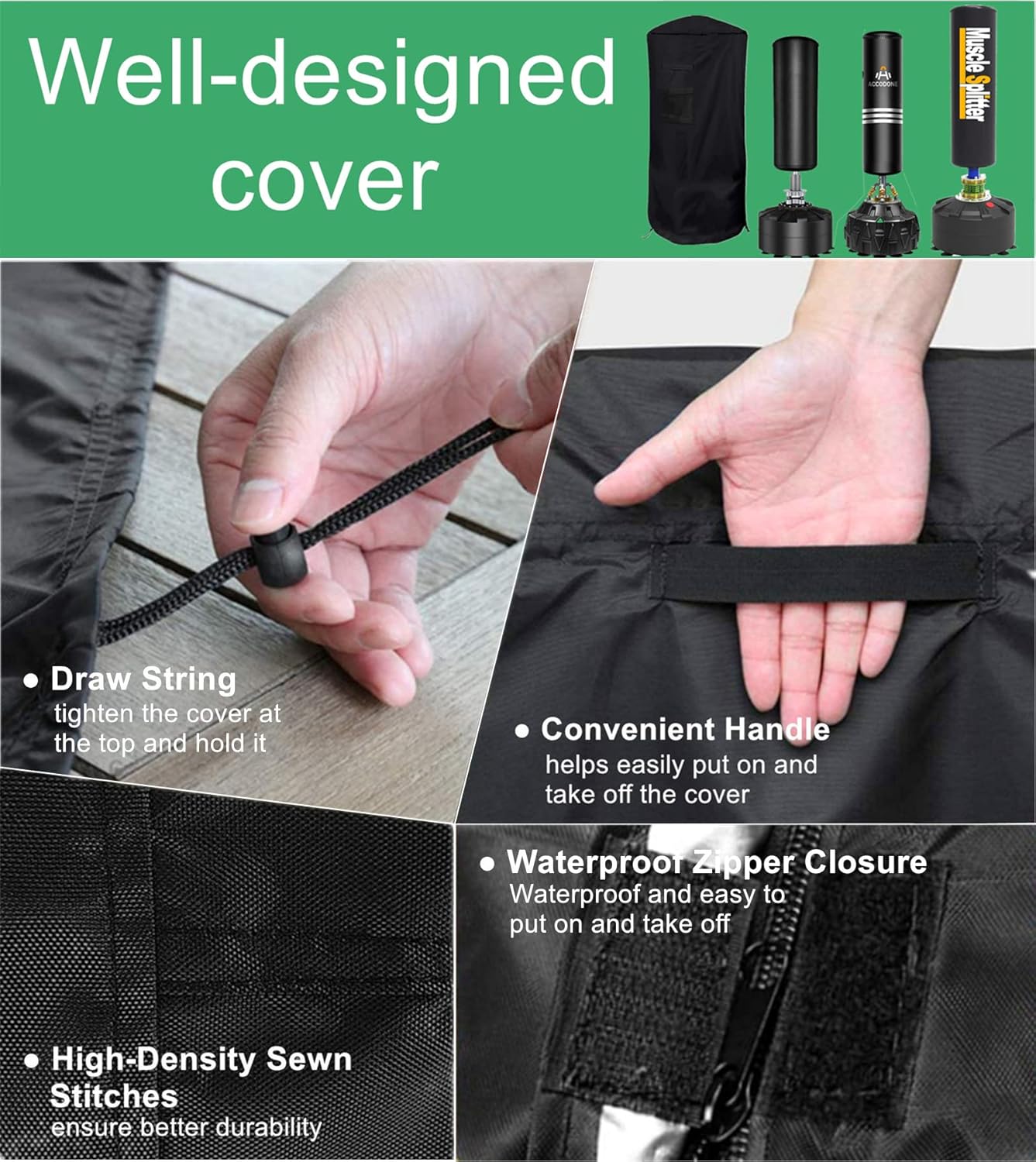 EASY TO SET UP AND CLEAN: The freestanding punch bag cover protector is designed with adjustable hem and upgraded metal zipper closure, 2 reinforced handles on the side make it easier to put on and take off quickly, Just lift the standing punching bag cover to the top of the punching bag, zip it and pull the draw string, one person is enough. The waterproof fabric makes the protective cover for freestanding punching bag easy to clean, just rinse with water or wipe dry with a cloth