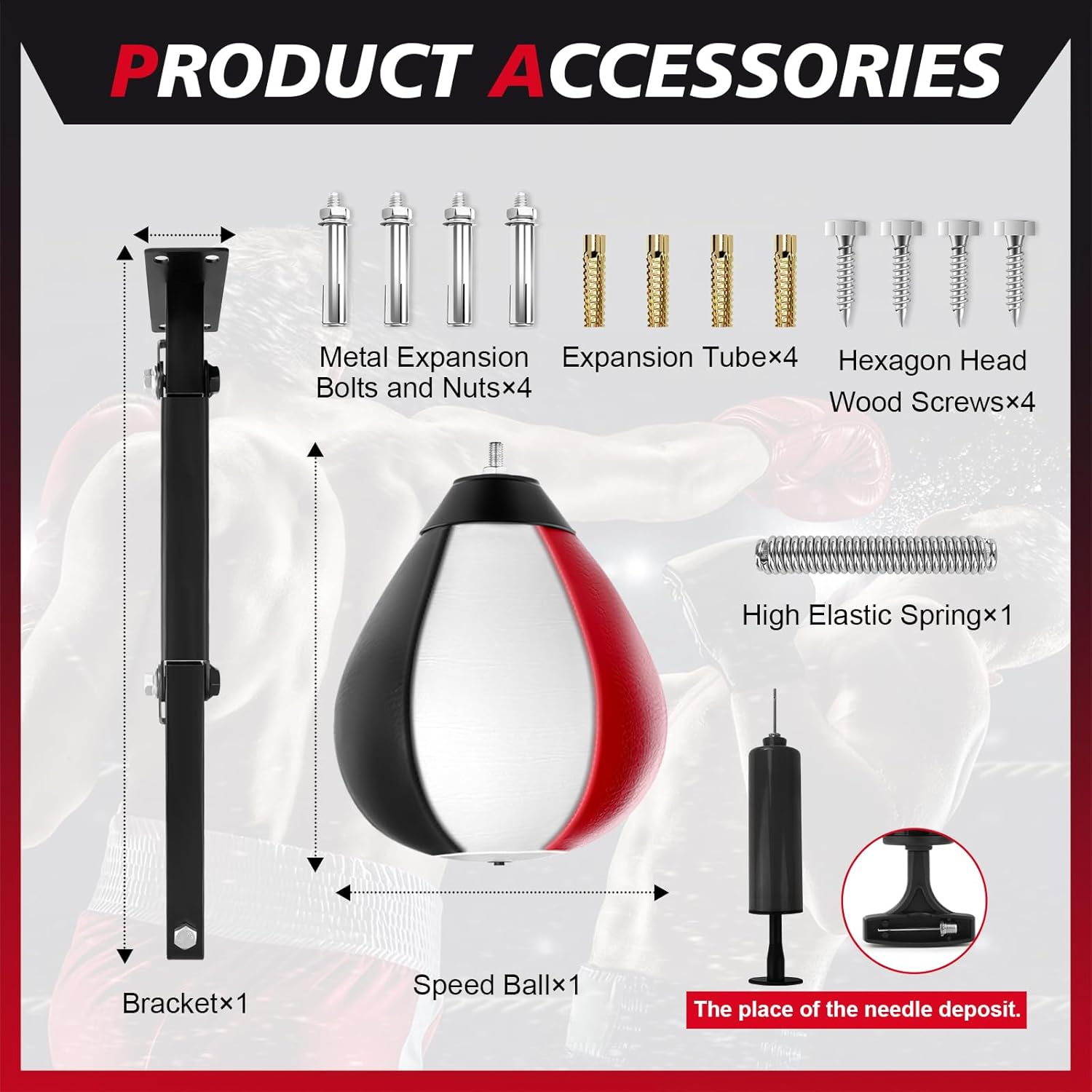 Package Come with: The package include speedbag, adjustable wall mount, high elastic spring, air pump, wrench, different bolts accessories and instruction.