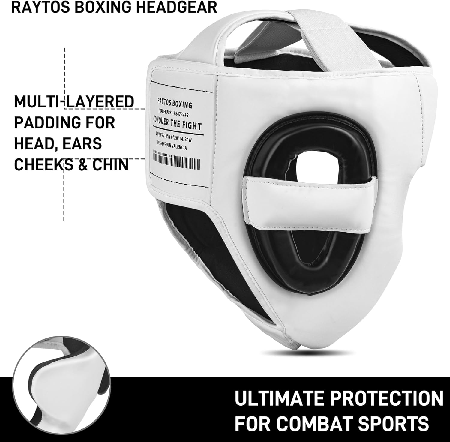 Raytos headgear delivers uncompromising protection. Raytos designed multi-layered padding to shield the forehead, cheekbones, side face, and chin. Triple overlap Velcro ensures a secure fit. Crafted for comfort and clear vision, our headgear is the ultimate ally in combat sports.