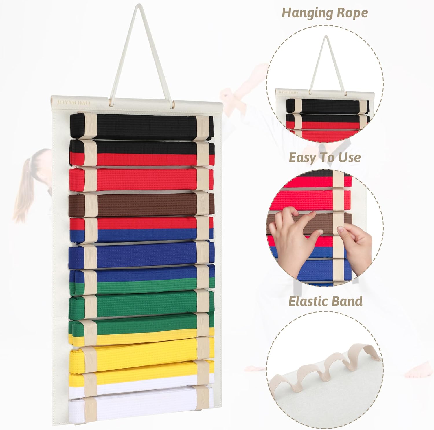 Space-Saving Design: Our Karate belt storage solution is ingeniously designed for wall, door, or wardrobe hanging. Not only does it save valuable space, but it also keeps your martial arts belts neatly organized and easily accessible.