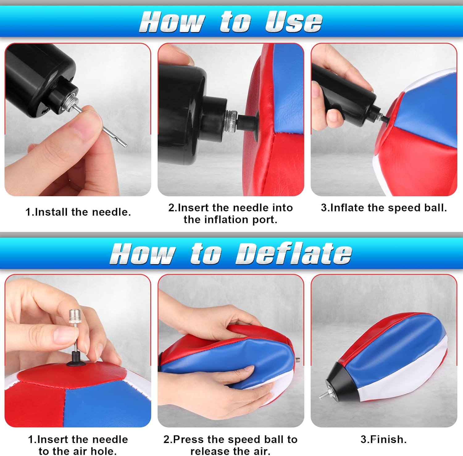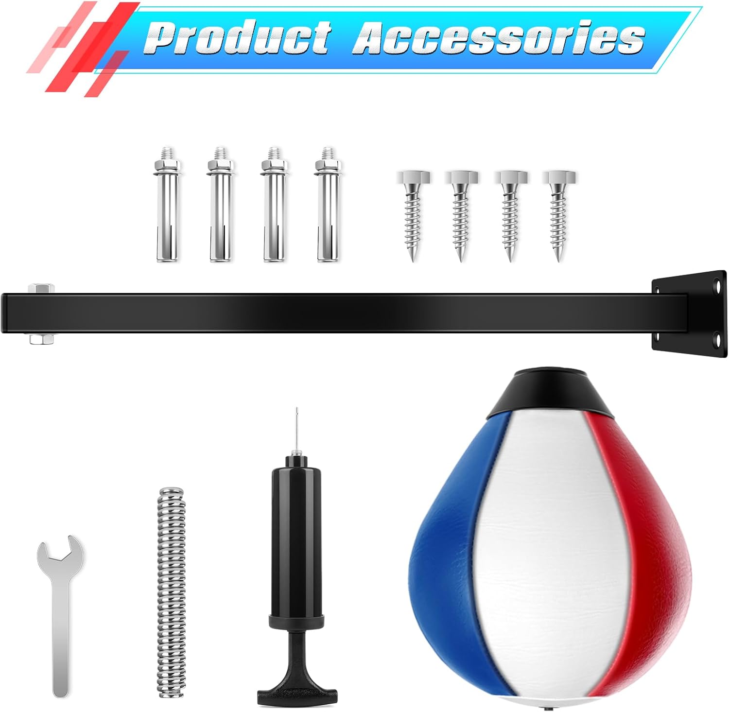 Package Come with: The package include boxing speed bag, speed bag mount, high elastic spring, air pump, wrench, different bolts accessories and instruction.