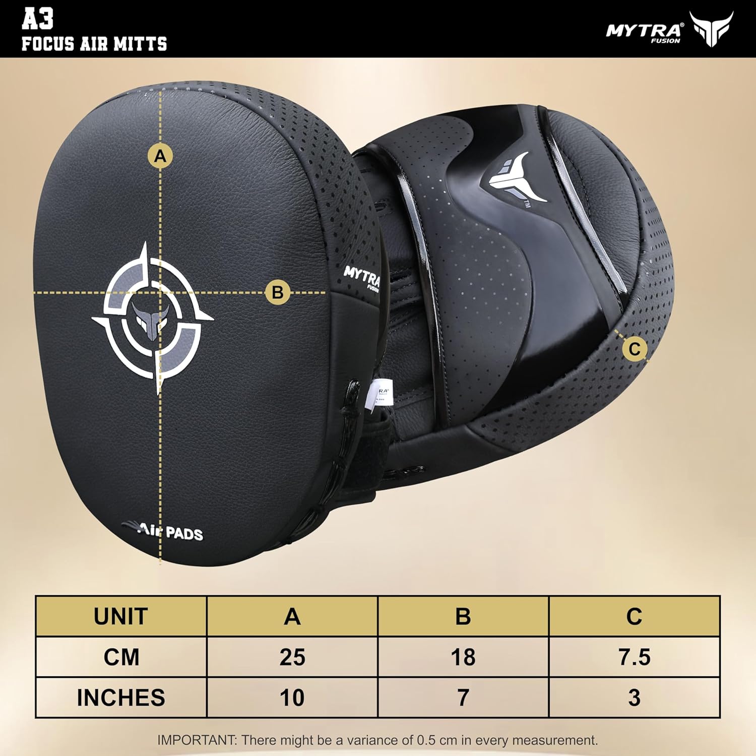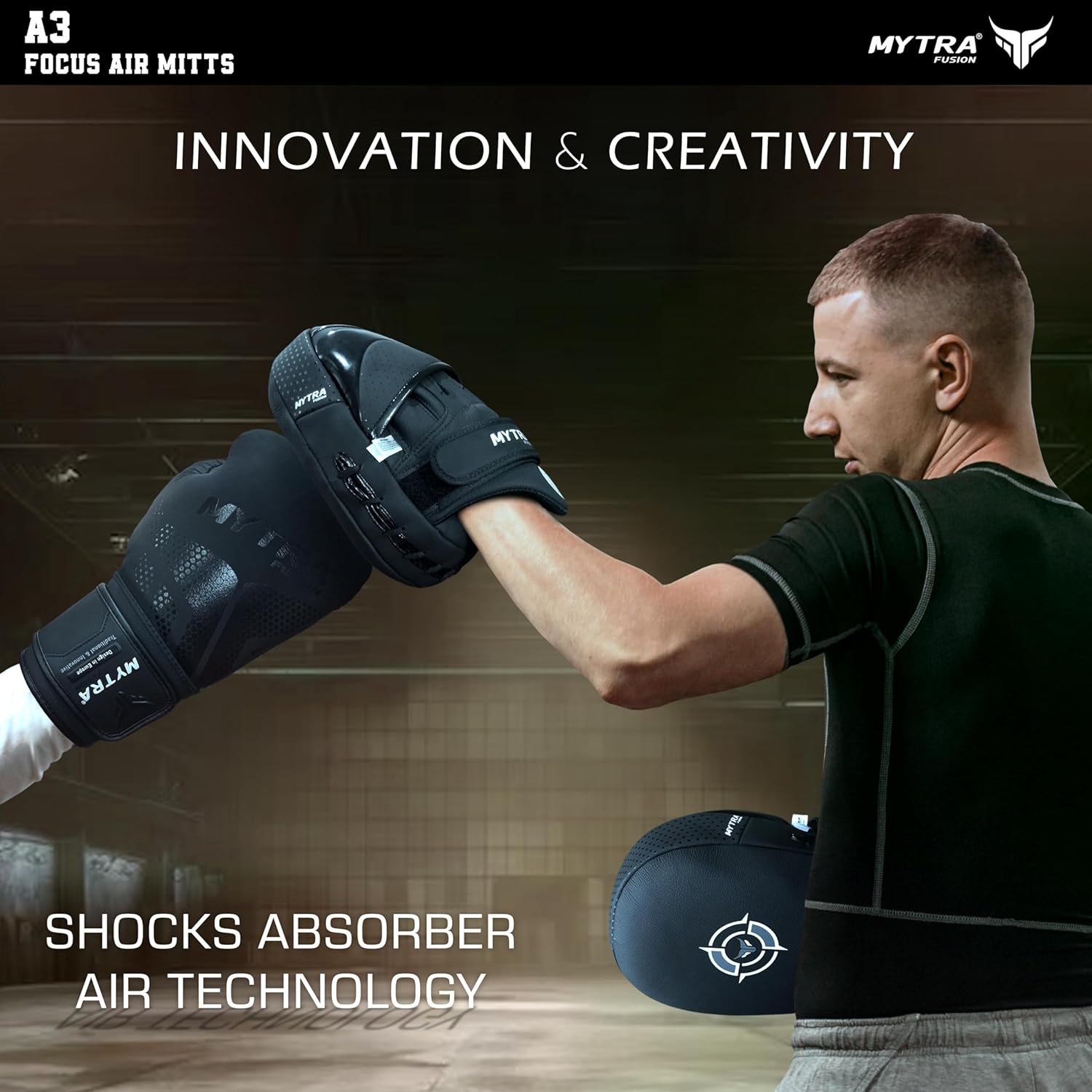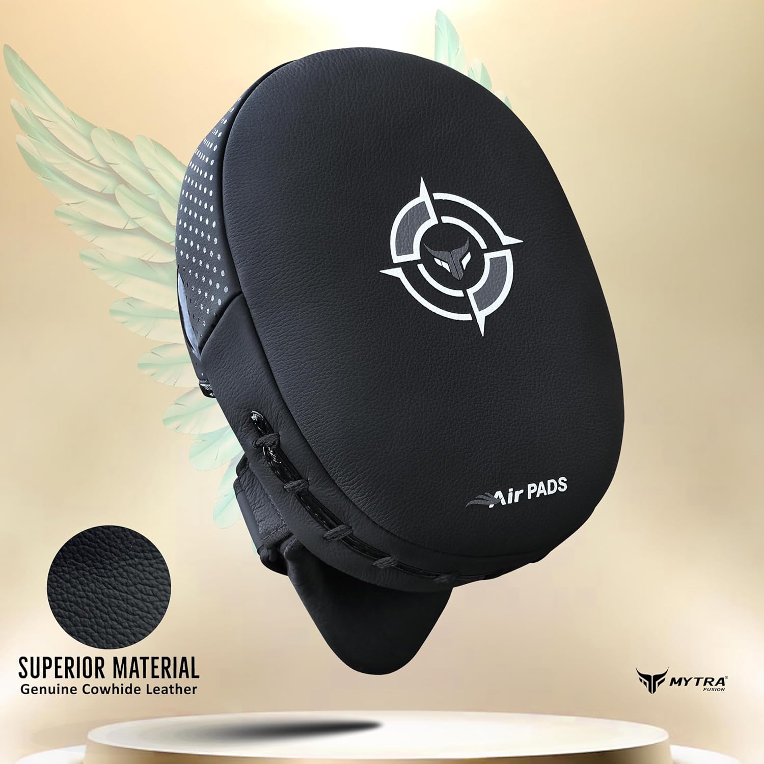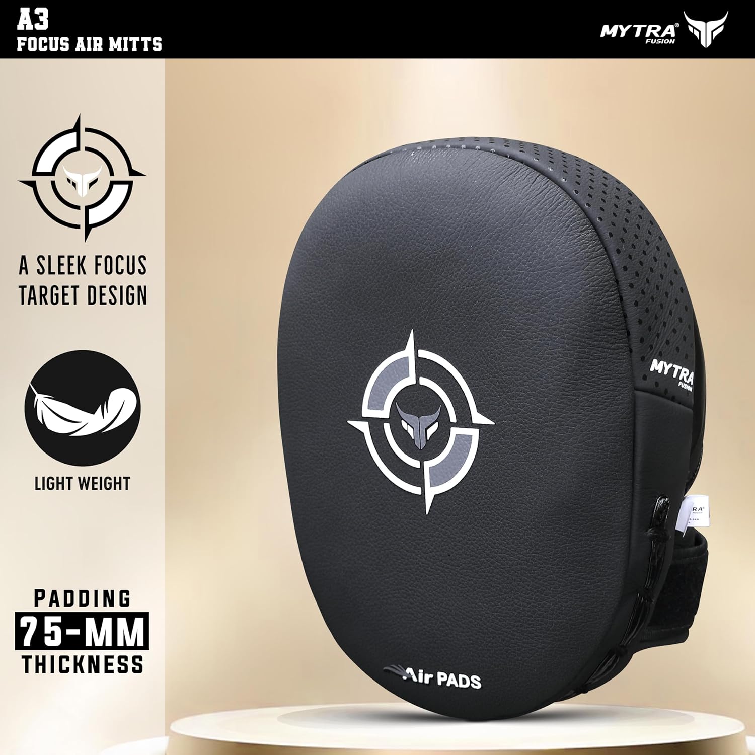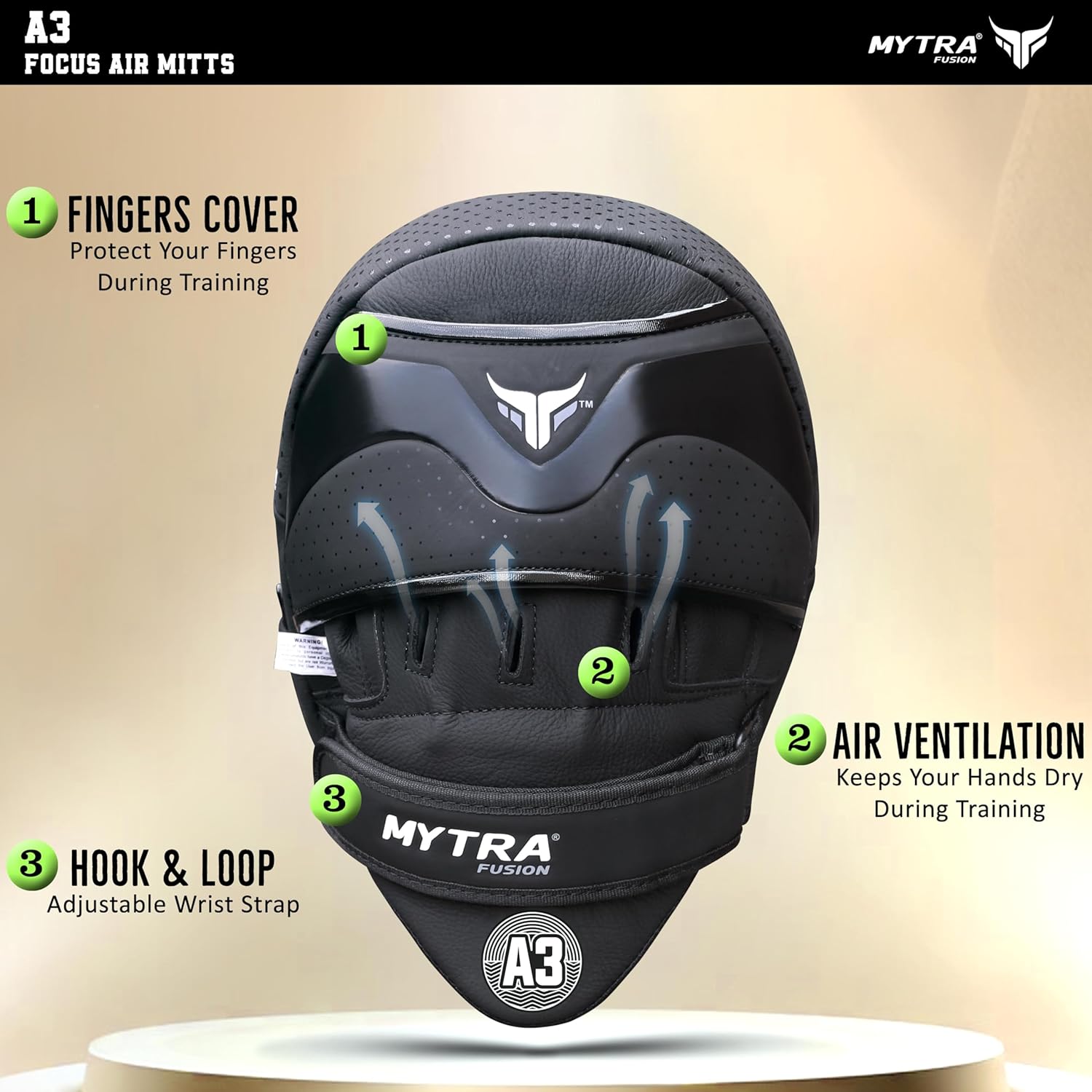 〖 FINEST QUALITY REAL LEATHER 〗 Mytra Fusion A3 Air focus mitt made of premium quality Real Leather and has the ability serve as a best training companion. These focus pads give you speed, flexibility, and power to train harder and better.