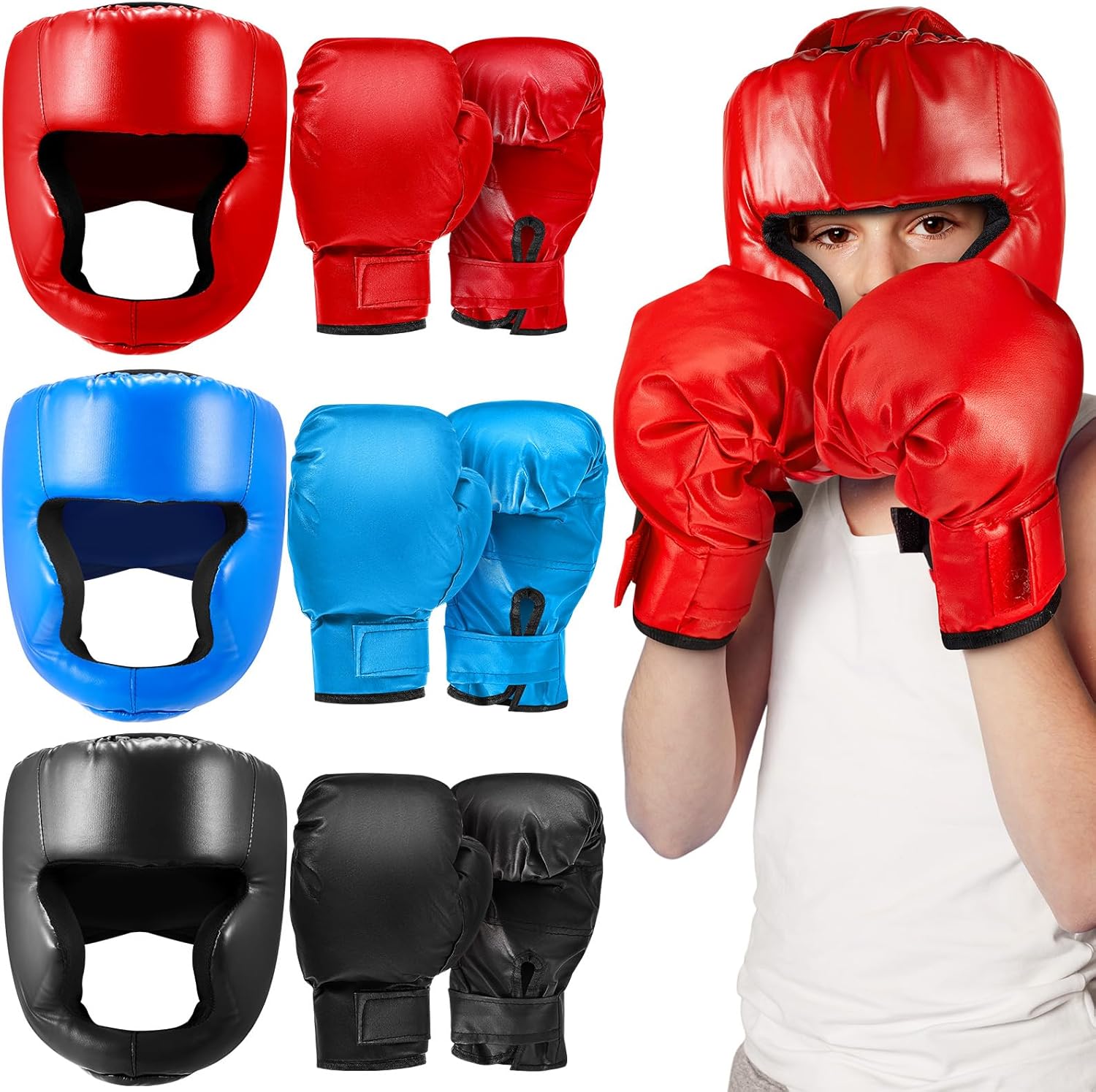 Complete Package for Protection: experience all around safety with this boxing headgear and gloves set, the package includes 3 boxing helmets and 3 pairs of boxing gloves in black, blue, and red, providing complete protection for your head and hands during intense training sessions