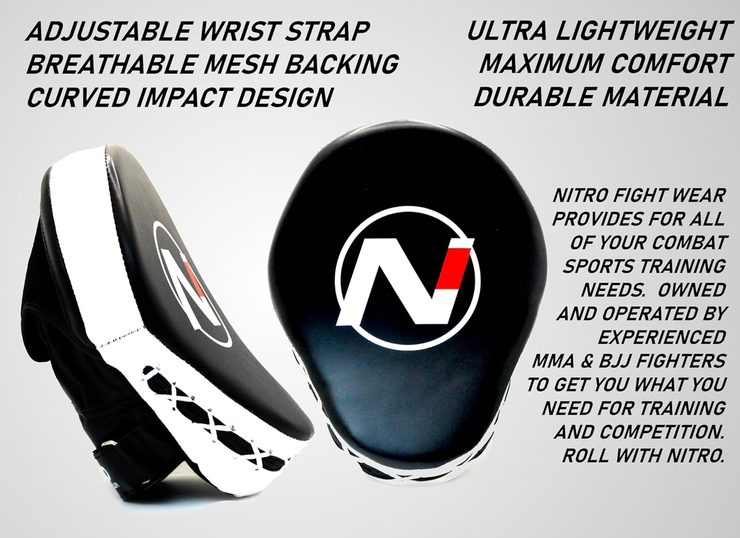 Get ready to level up your training with Nitro Fight Wear focus mitts. These durable and comfortable mitts are perfect for boxing, muay thai, and kickboxing workouts. Made with high-quality leather and dense padding, these mitts provide excellent protection for both the trainer and the athlete. The ergonomic design ensures a secure fit and reduces strain on the wrists during intense sessions. Improve your accuracy, speed, and precision with these versatile and reliable focus mitts. Whether you’re a beginner or a seasoned pro, these mitts are essential for enhancing your striking skills. Elevate your training experience and achieve your goals with Nitro Fight Wear focus mitts.