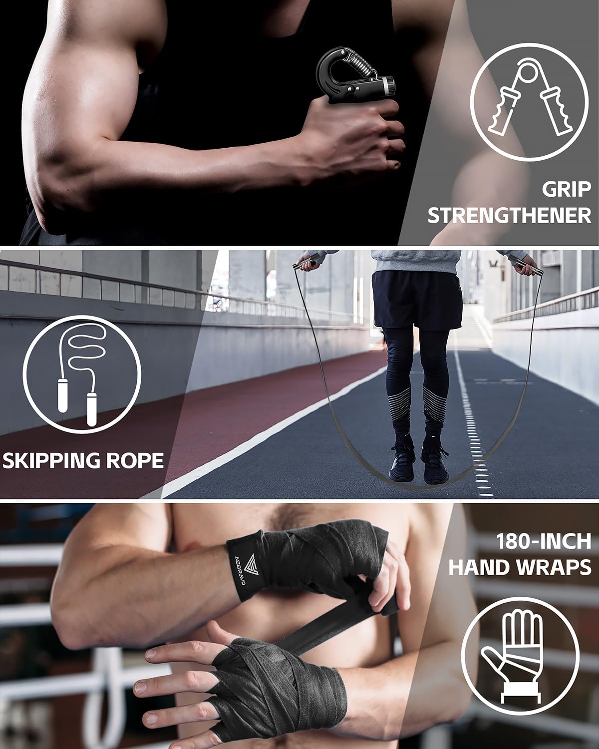 【Additional Fitness Tools】This set includes a skipping rope, which can improve cardiovascular fitness, enhance coordination, and aid in calorie burning. Also included is a grip strengthener, which is aimed at building hand and forearm strength for more powerful punches.