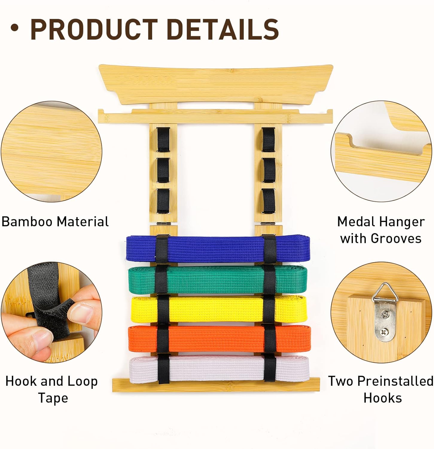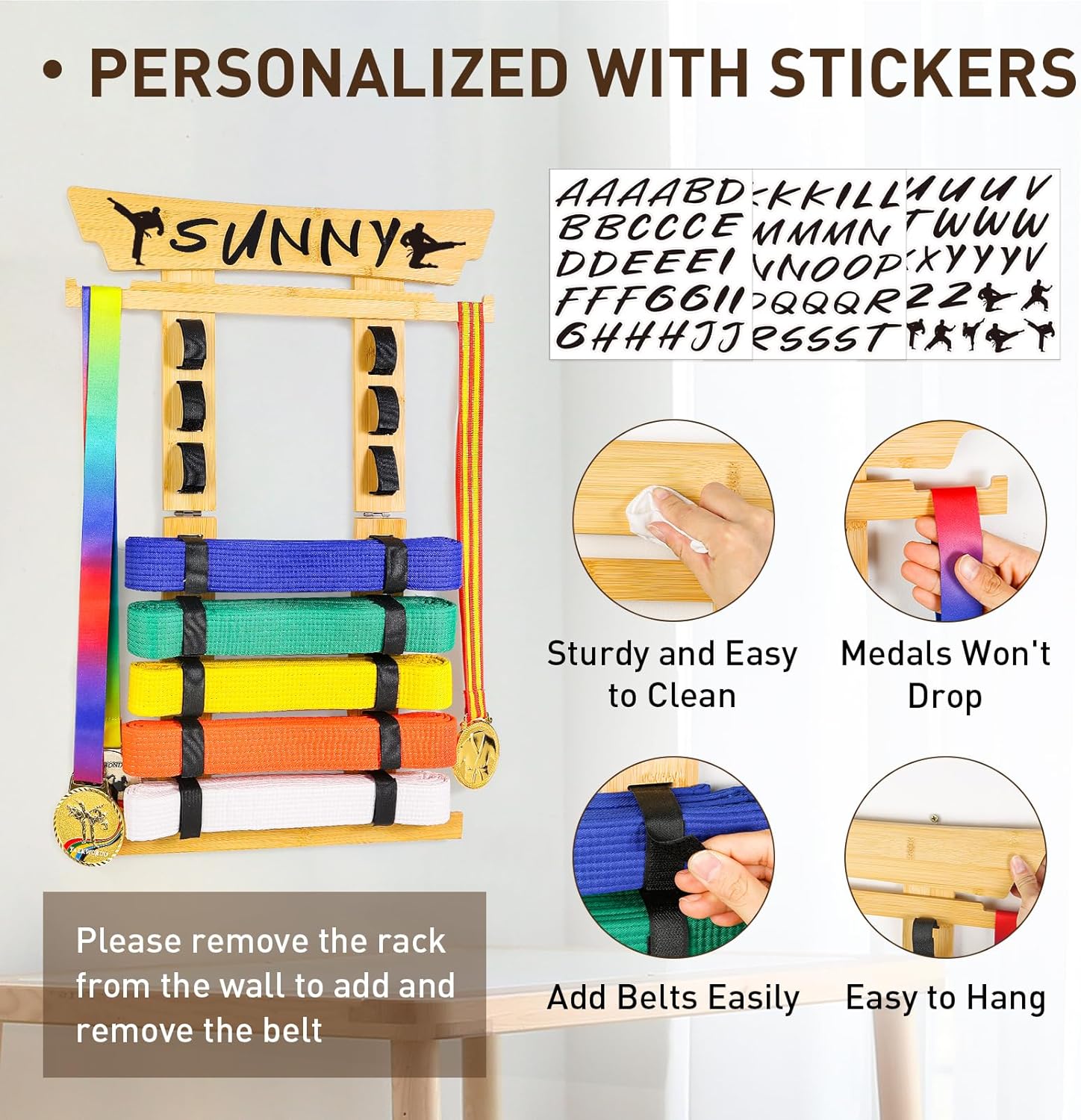 Belt Display Rack: Made of stronger and more stable materials. Easy to clean and looks rustic. Easy to clean and looks rustic. Hold 8 belts in total, each slat has a enough wide space for bjj, taekwondo, jiu jitsu martial art belts. It’s not only a way to celebrate their milestones but also keep them motivated