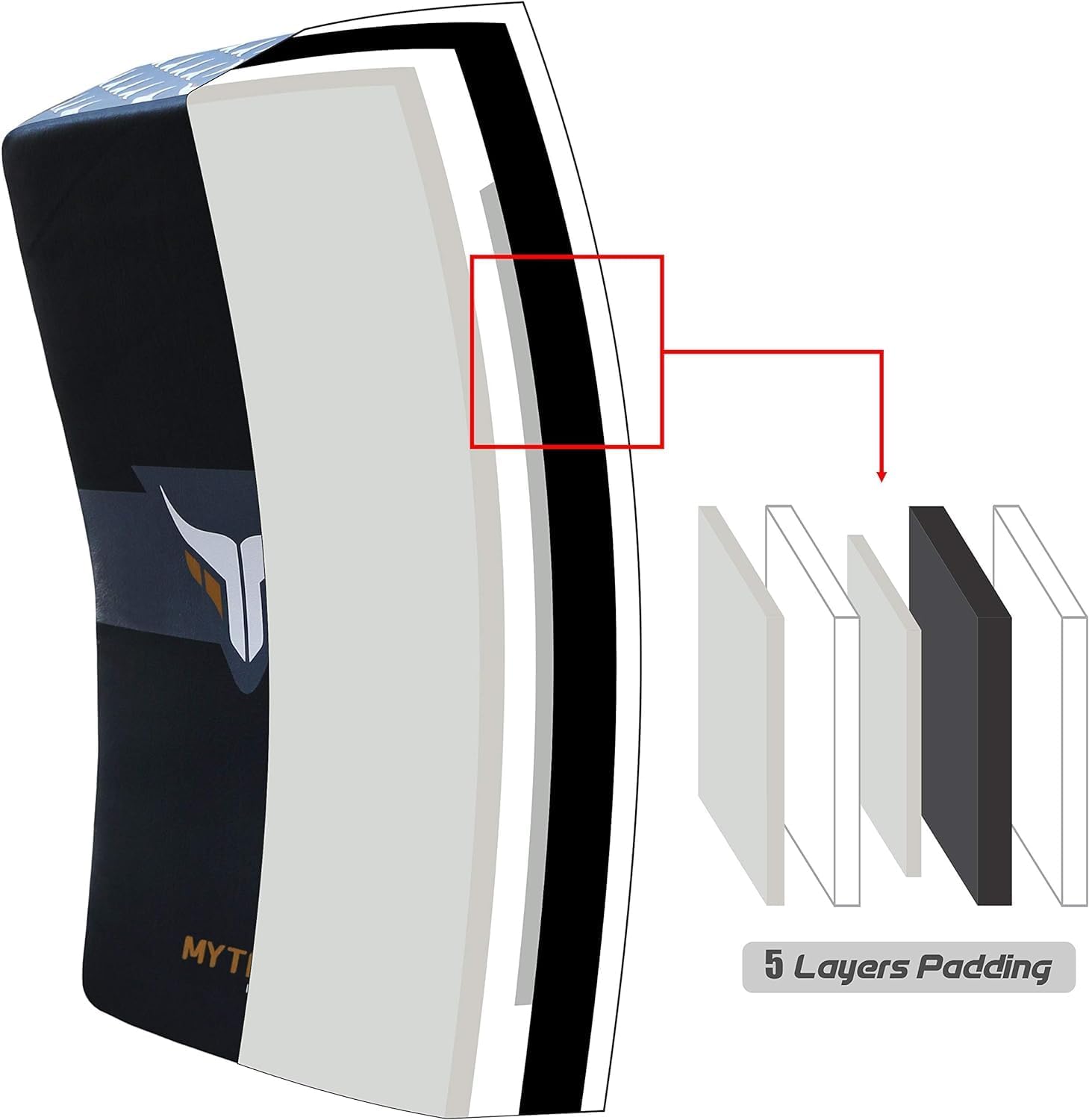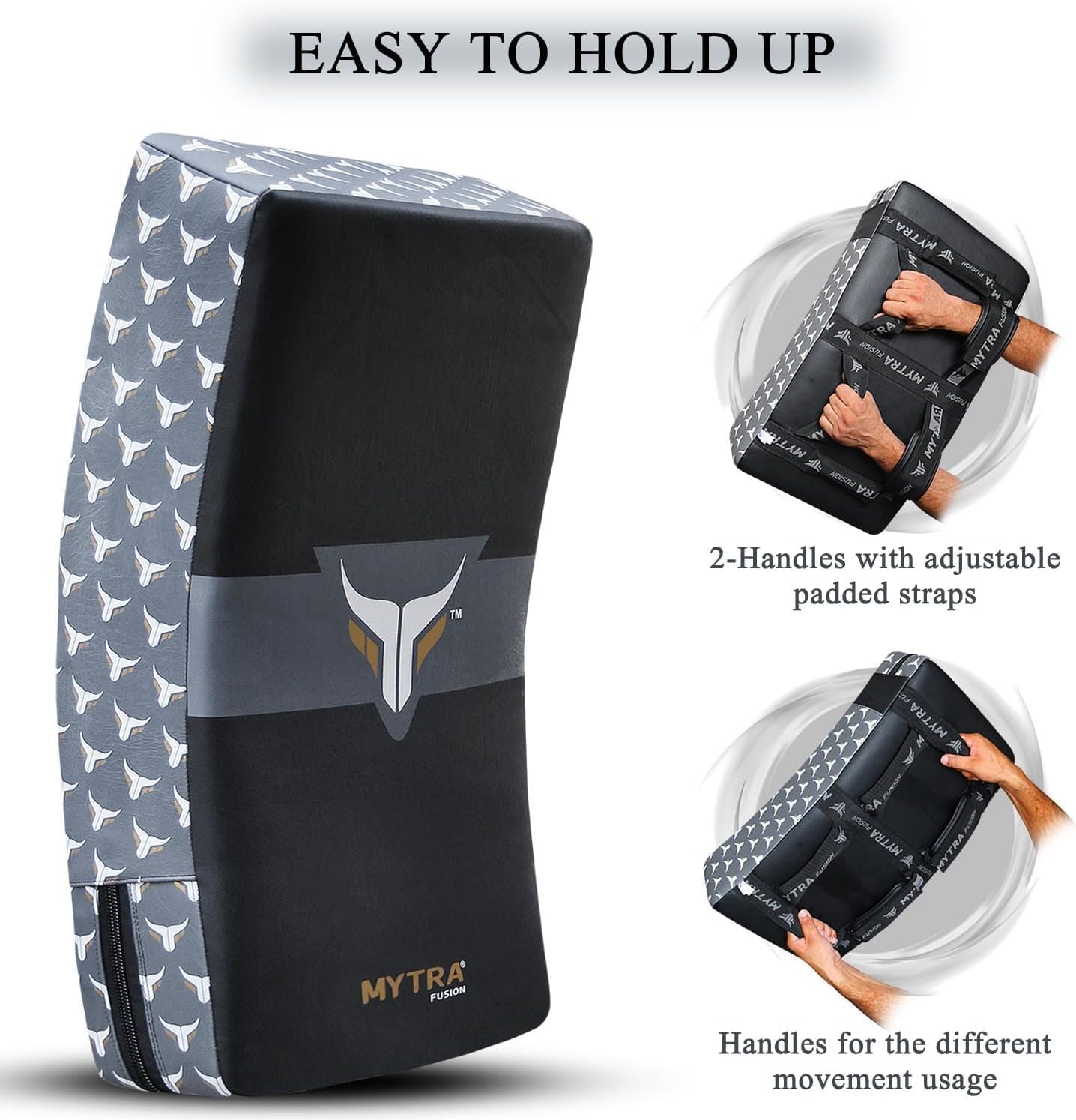 ✅ REINFORCED GRIPS: The Mytra Kick Shield is designed for better power absorption. It features three fully reinforced hand grips, so you can comfortably support it from a variety of angles, plus its long horn logo look striking.