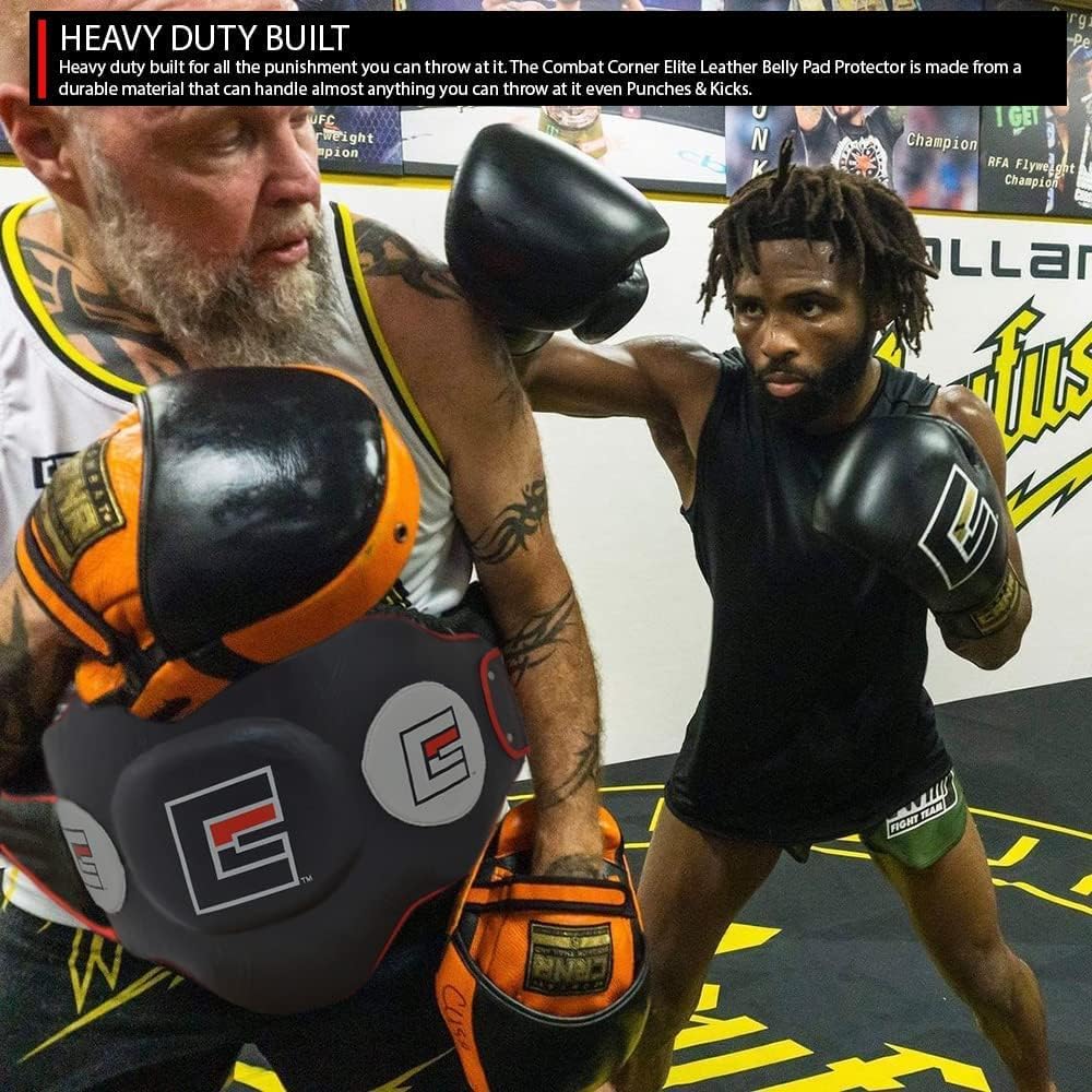 ✅ HEAVY DUTY BUILT – Heavy duty built for all the punishment you can throw at it. The Combat Corner Elite Leather Belly Pad Protector is made from a durable material that can handle almost anything you can throw at it even Punches & Kicks.
