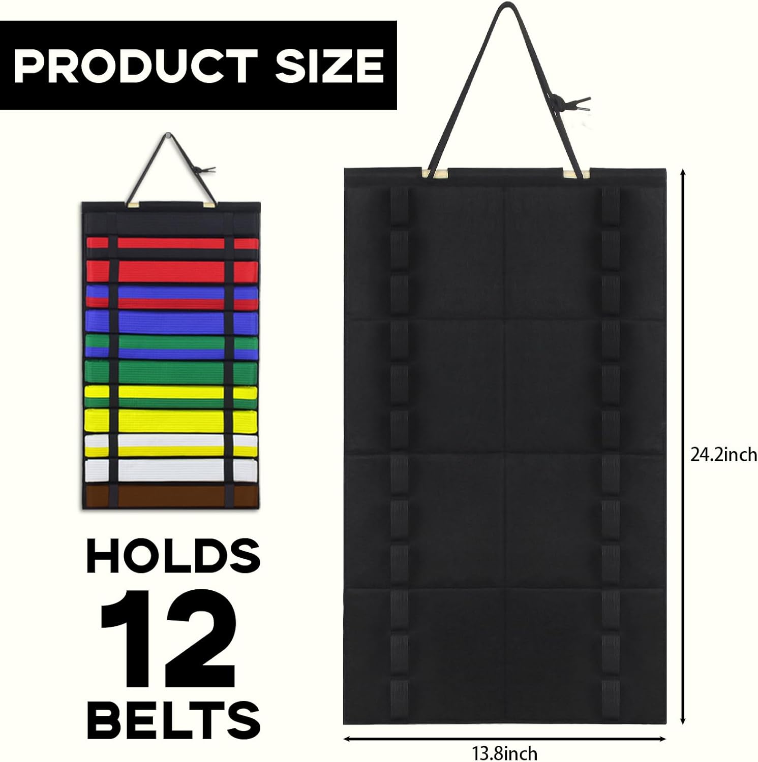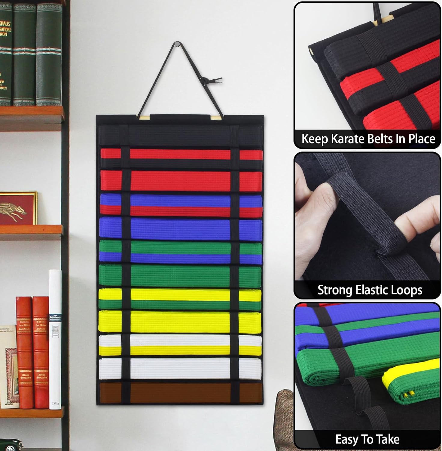 【High Quality】Karate belt display rack made of high quality felt material and elastic loops, holds up to 12 belts, perfect for karate belts, martial arts belts, taekwondo belts and more.