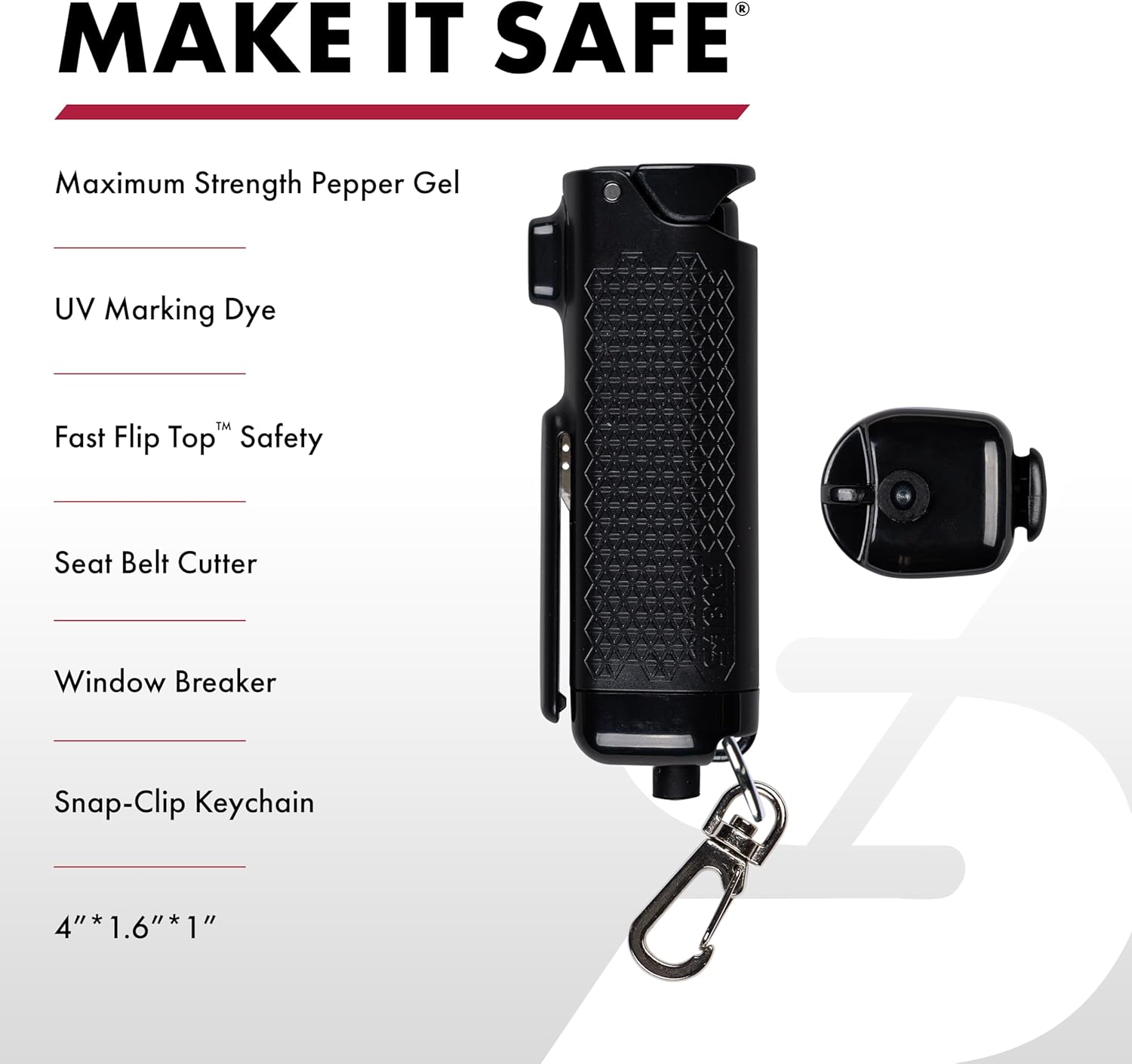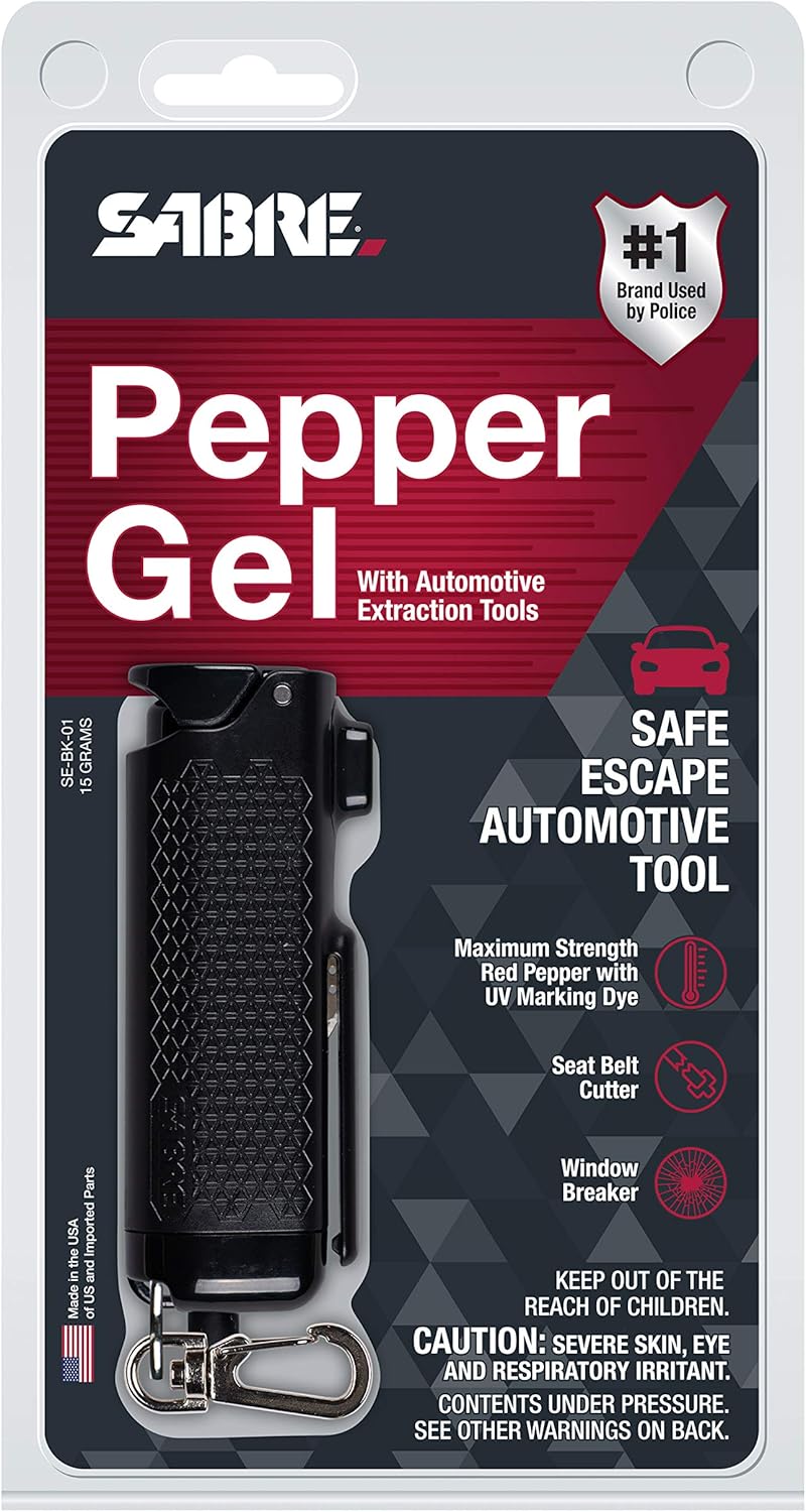 Make your commute safer with the SABRE Safe Escape 3-In-1 Pepper Gel. This pepper gel provides the tools to help you get out of your vehicle in the event of an emergency and protect yourself against an attack. Seat belts can be an obstacle to get out of after an accident. The built-in belt cutter helps to cut seat belts and free yourself in an emergency. The window breaker tool helps to break windows if your vehicle doors are jammed or the electric windows fail to operate. This unit deploys 25 powerful bursts (5x the competition) of pepper gel to protect against multiple threats at a safe distance. It includes UV marking dye to help the authorities identify an attacker after they’re sprayed. The Fast Flip Top design allows for the immediate deployment of your pepper gel in high-stress situations when seconds count. With an industry-exclusive HPLC laboratory, only SABRE guarantees its maximum strength formulation in every canister to help give you peace of mind, certainty, reliability, and safety when you need it most. SABRE pepper gel is made in the USA. Family owned and operated for more than 45 years, SABRE is the #1 brand trusted by consumers worldwide for pepper spray and is a leader in developing safety programs and safety videos to maximize end users’ safety. Empower yourself with extreme stopping power when you need it most.