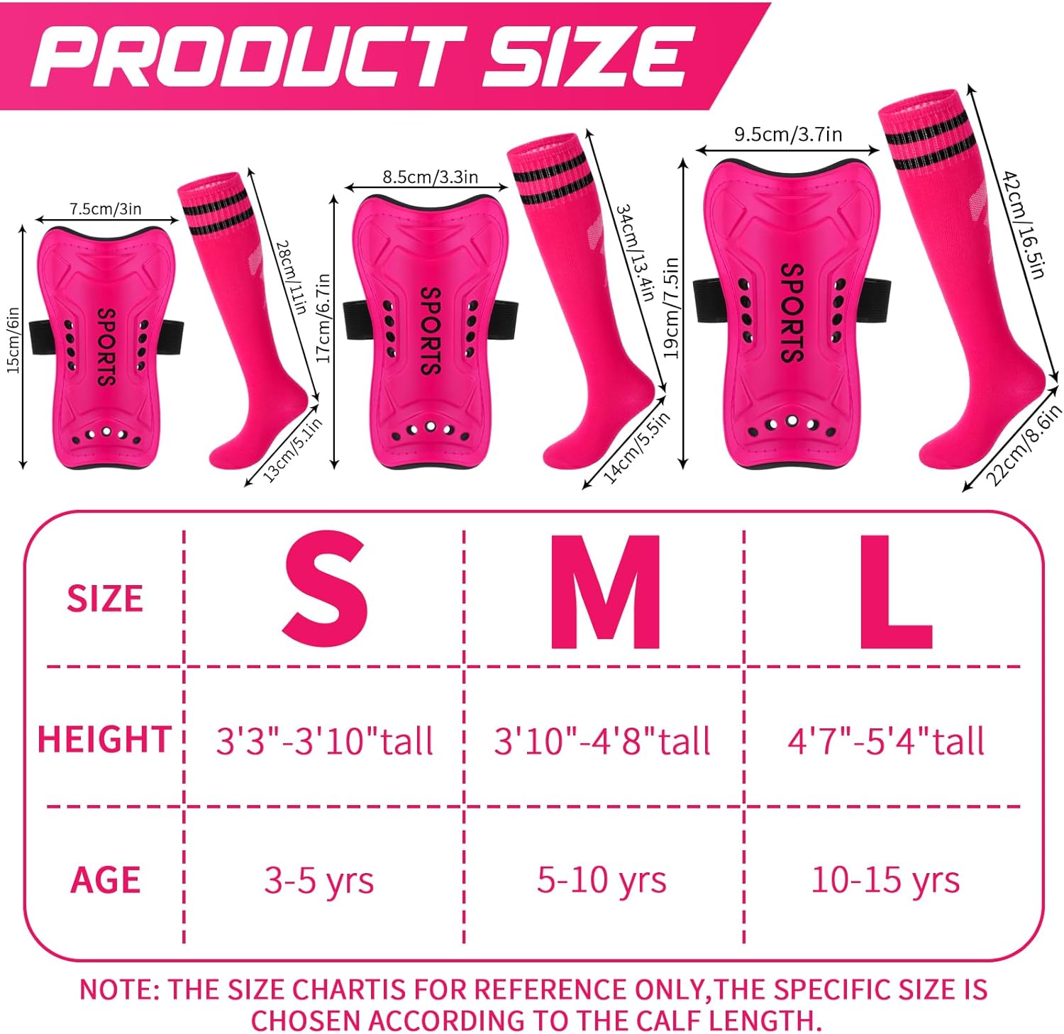 3 Sizes: the package comes with 3 sizes of soccer shin guard and matching socks, which can satisfy wearing needs of different ages; Shin guard size namely, S size: 15 x 7.5 cm/ 6 x 3 inches, suitable for 3-5 years old; M size: 17 x 8.5 cm/ 6.7 x 3.3 inches, suitable for 5-10 years old; L size: 19 x 9.5 cm/ 7.5 x 3.7 inches, suitable for 10-15 years old; In order to ensure wear comfort and fit, the socks are also matched to the corresponding size; Please carefully check your size before ordering
