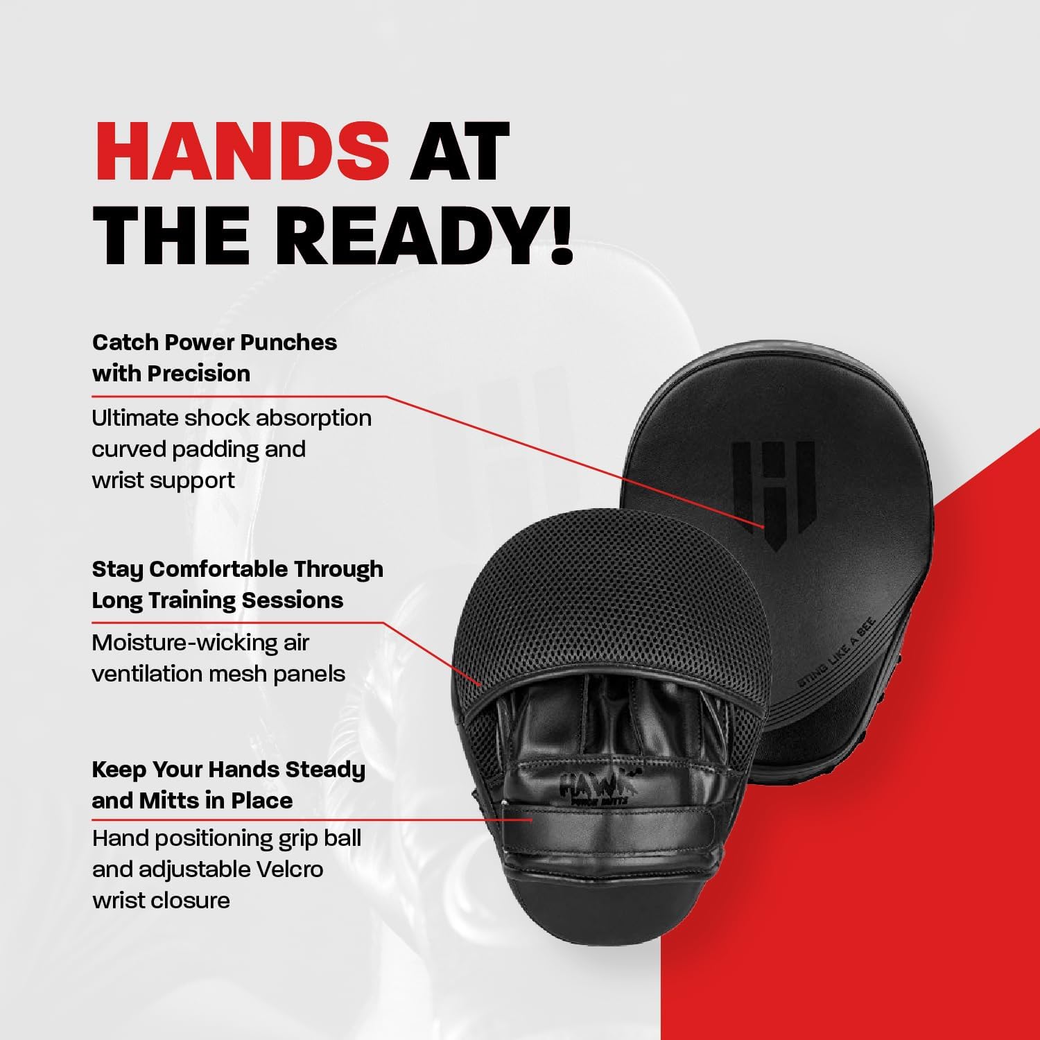 Eyes on the Prize. Stay cool, comfy, and odor-free all day with large anti-perspiration mesh panels on our boxing focus mitts. Stay razor-focused and help your students level up their boxing game.