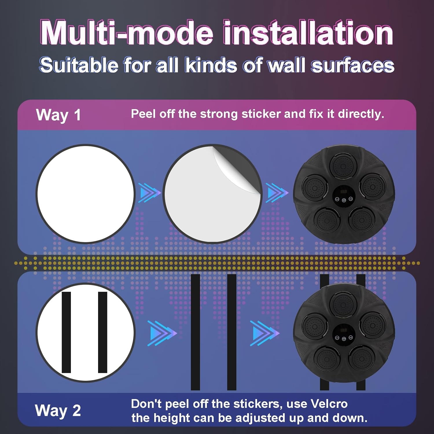šµćMUSIC + BLUETOOTH ćSmart music boxing machine comes with upgraded speakers and surround sound, supports Bluetooth pairing. As your favorite songs play, cool light effects and music flashes in rhythm, perfectly synchronized with your boxing moves. Make your boxing training more fun and exciting.