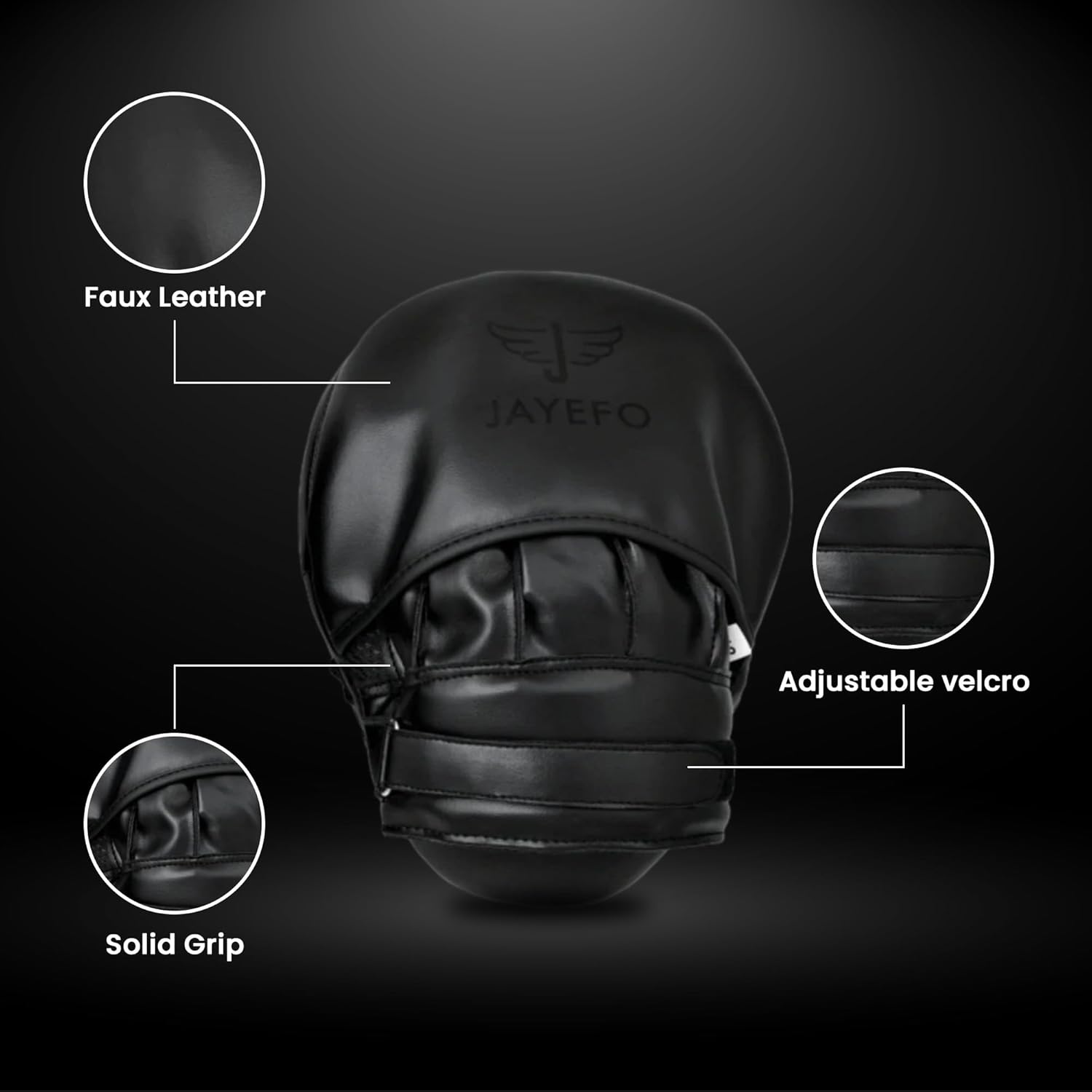 Jayefo Glorious Boxing Pads Focus Mitts for Traning Boxing mits are made of high-quality materials and construction. Boxing pad features a 10 years’ warranty hitting pads boxing, secure hook and loop closure for great wrist support kickboxing pads boxing, light weight for better mobility kickboxing pads set, ventilated mesh for more breathability boxing training gloves, ideal to train boxing and MMA. The curved design is padded with 3 layers to provide smooth punching impact while training. Curved punch mitts are the perfect way to improve your speed, accuracy and endurance. These double stitched boxing hand pads come with a grip ball and five finger gloves for best grip while sparring. Made with industrial strength veg leather construction, these sparring pads fit easy in your gym bag. With extra padding for protection, the Jayefo logo is centered on the target for boxing. These punch mitts are great for training and sparring. They have a thick foam padding that protects your hands and wrists from injury. The hand wraps are made of high-quality cotton which allows you to get a better grip on the pads. kickboxing pads are adjustable, so you can use them with both hands. These boxing hand pads are suitable for all kinds of martial arts such as muay thai, kickboxing, MMA and karate.