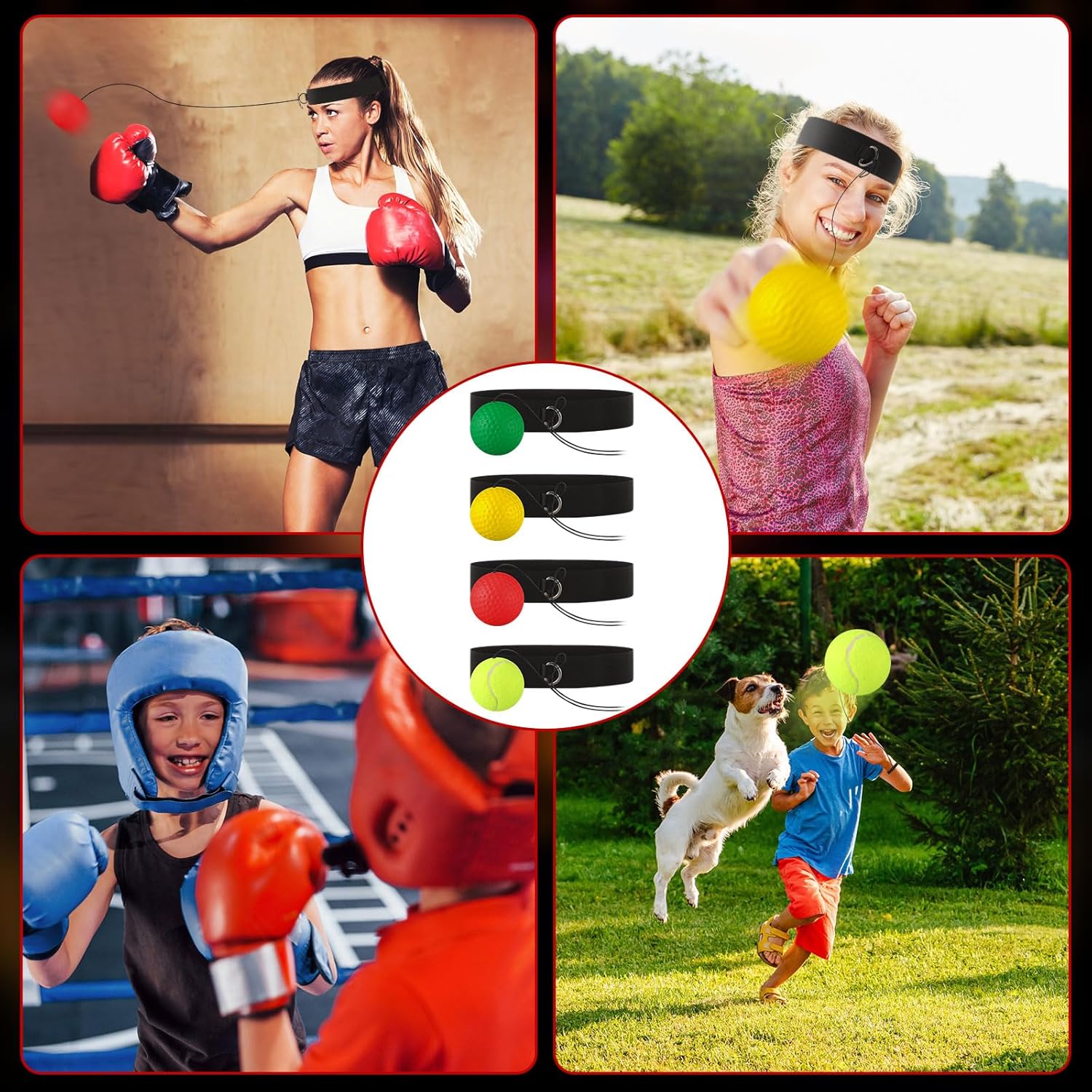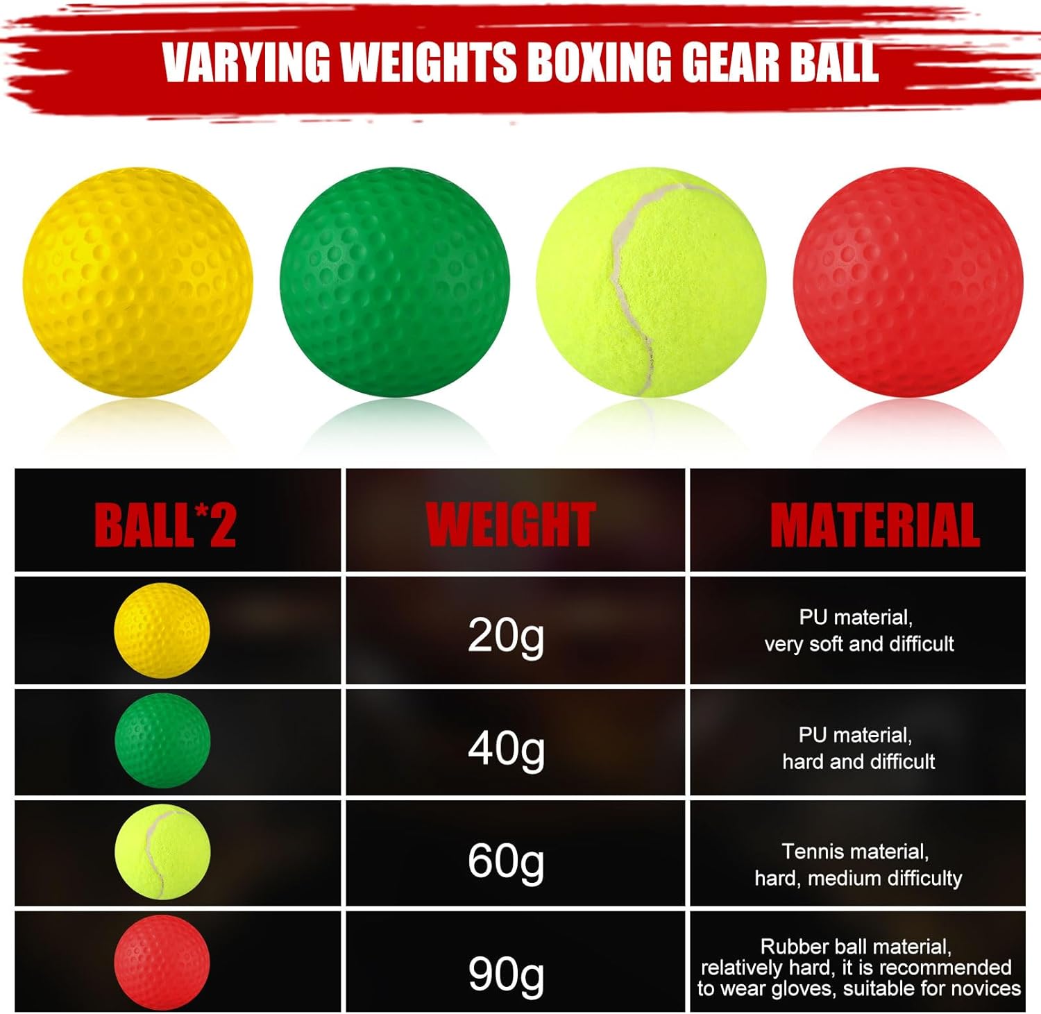 4 Varying Weights Boxing Gear Ball: the boxing equipment for training at home set comes with 4 different weight balls: yellow PU ball 20g, green PU ball 40g, yellow tennis ball 65g, red rubber ball 85g, and come with headbands, to cater to different skill levels and training goals, making it a versatile tool for all levels of boxers