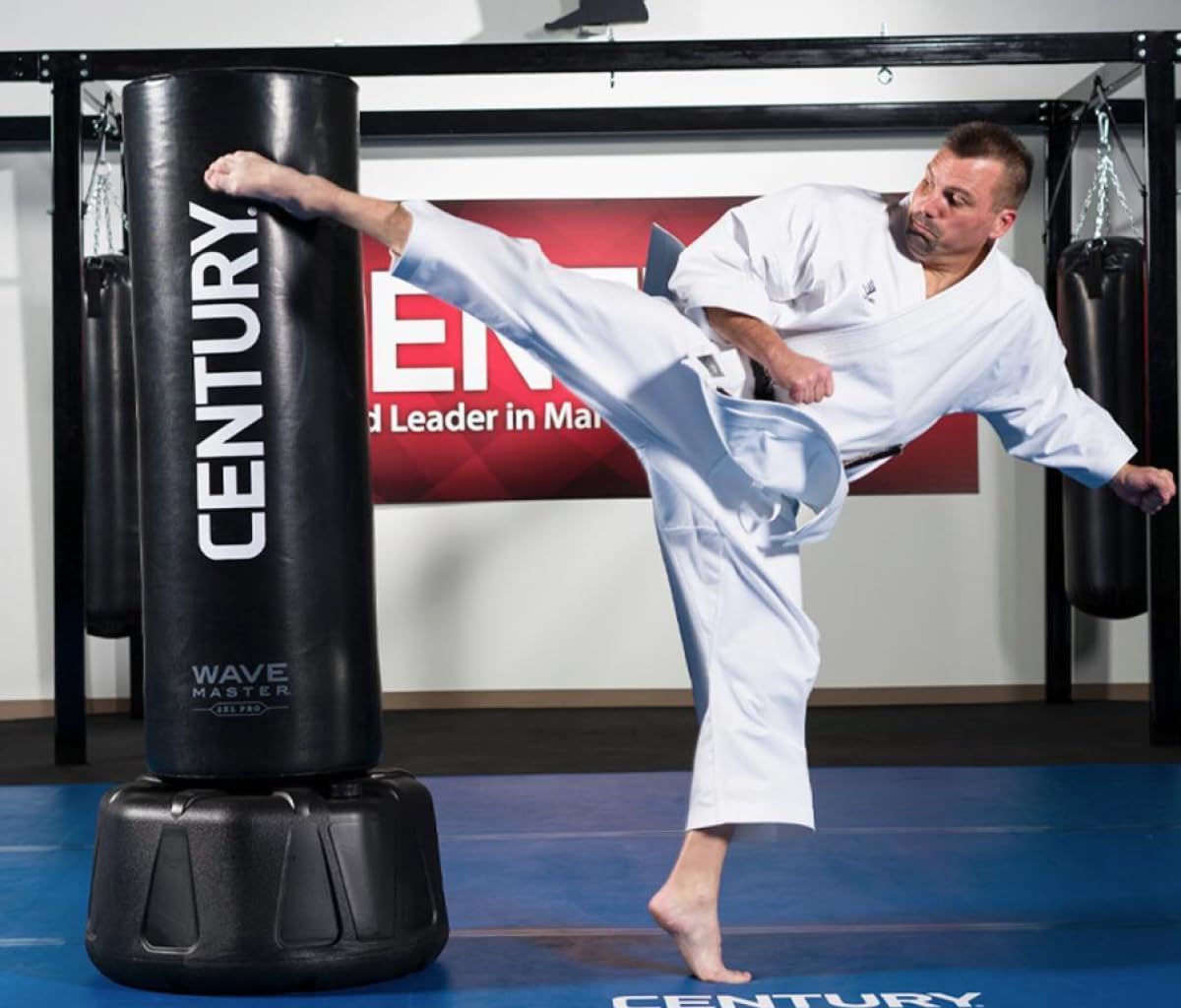 Have you ever wondered how the original (and still most popular!) freestanding bag came to be? Once upon a time, if you wanted to train on a bag, you needed to hang it. This meant drilling holes in your ceiling or wall, or investing in a hanging bag stand. Although all these options are fine and dandy in some situations, sadly, they don’t work for people with limited space, those who can’t/don’t want to drill into their walls, or those who need to use one room for multiple purposes and therefore can’t have permanently affixed bags. We decided that was no good. So, we made the Wavemaster! This freestanding bag can be used for the same types of training as a traditional heavy bag, but with several advantages! First, the Wavemaster can be easily moved! Just tip it onto the side of the base and roll it. Even when it is fully filled (use sand or water, and it weighs up to 250 lbs.), it’s a one-person job. Second, it’s simple to set up! Once it arrives at your door, all you have to do is: 1) take it out of the box, 2) set up the base, 3) fill the base with your choice of heavy substance, 4) put the bag onto the base. The end! No special tools, equipment, or skills needed! Not to mention, the Wavemaster is adjustable! There are seven height settings, from 47” to 68”, so whether you’re working oblique kicks or head kicks, you can use the Wavemaster. The bag section of the Wavemaster is 24” tall with a 19.5” diameter. Available in Black, Blue or Red Wavemaster is a registered trademark of Century, LLC. U.S. Patent #5,624,358 **Note that there is an additional shipping fee of $15.00 for this item.