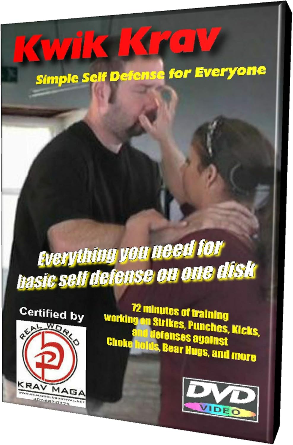 Simple Self-defense Everything you need for basic self defense on one disk Kwik Krav is our system of Krav developed for those who want a basic ability to defend themselves without devoting hours & hours to a training routine. This video is taught by Kurt R. Howland, LPN, founder of “Real World Krav Maga”. In this DVD he teaches a system that uses very natural and instinctive moves. This system works without alot of training due to the fact the techniques are based on these natural movements. This is a one disk series that quickly gives you the basics. Our new video can be used by all age groups, Male & Female. You’ll spend 72 minutes working on Strikes, Punches, Kicks, and defenses against Choke holds, Bear Hugs, and more as you learn in the comfort of your home. Kurt’s style is unique and is centered around using your attackers weight against them. This is a whole new way to look at self defense and gives those who don’t have the time to get to a gym a way to learn. About the Instructor Kurt served in the US Army where he trained in hand to hand combat. After the Army he became a member of the 399th Composite Squadron of the Civil Air Patrol in Danbury, Connecticut running Search & Rescue missions for four years. Through out his life Kurt has been involved with self defense of some kind. He started Wrestling in High School, then turned to Boxing. He boxed competitively for 20 years, and now trains boxers at Tainio’s Boxing Gym in Deltona, FL. He has also studied several different Martial Arts over the years, and now trains with an Ex Navy Seal in several different types of close combat including Krav Maga which he now instructs. Kurt founded “Real World Krav Maga” and teaches private and group classes. He his clients include private citizens, law enforcement officers, and corporate clients like Northrup Grumman. DVD media is -R, I am the producer of this video, all DVD’s are brand new. Shipped in durable and flexible