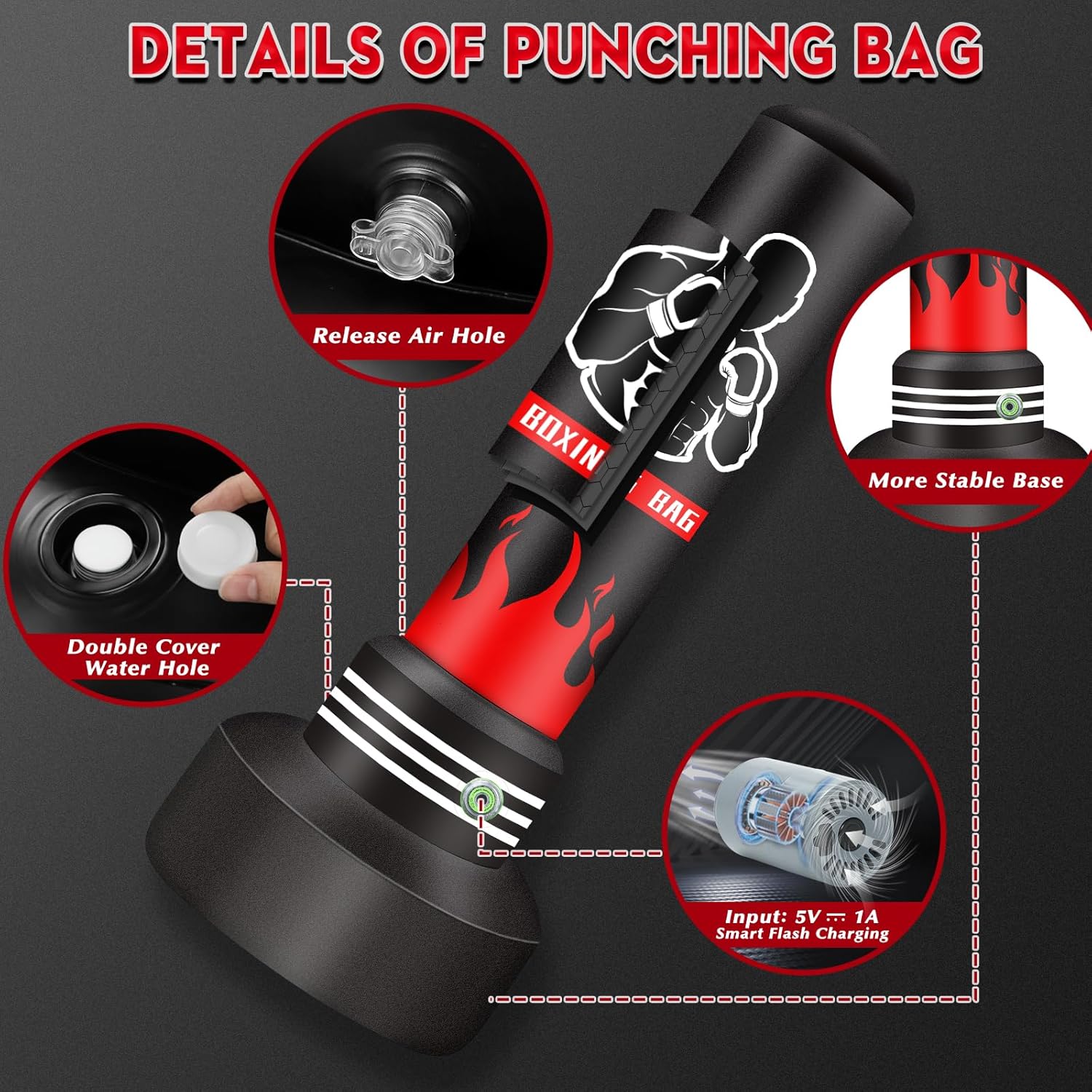 Widened Base Adult Punching Bag: 27.6” widened base make the punching bag stand more stable. Fill the base with water/sand and then inflate it with the automatic air pump. The base weighs 180 lbs when filled with water and 200 lbs when filled with sand. You can fill it with either material or a combination of both to ensure stability.
