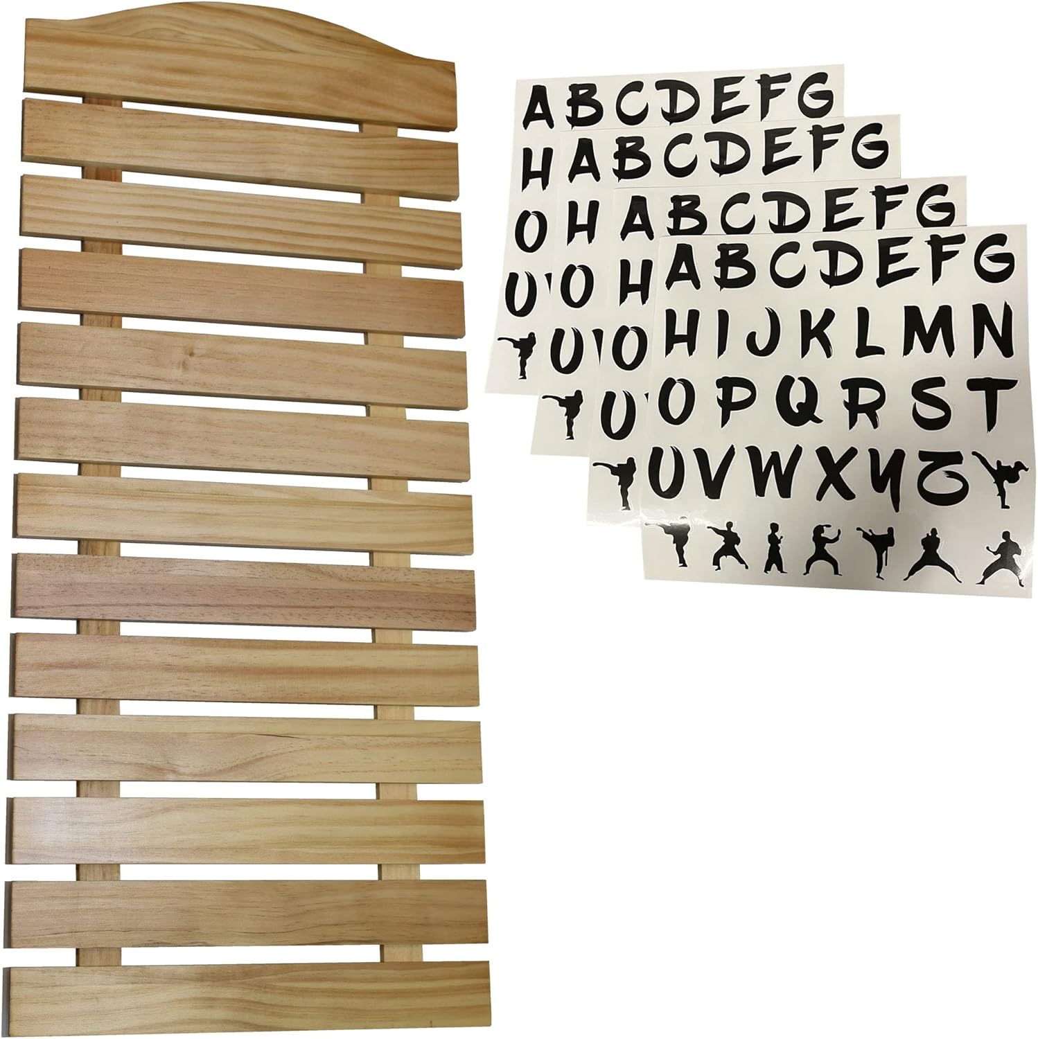 TWELVE BELTS: 12 Belt Martial Art Karate Belt Display. Beautiful Thick Premium Wood. 32 inches x 14 inches. Includes 4 sheets of premium quality stickers to personalize!