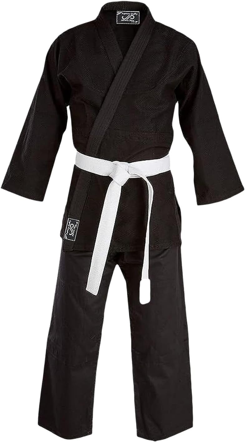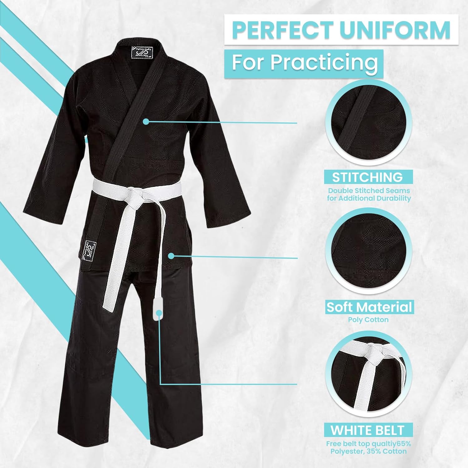 This Black Kids and Adult Karate Gi is the perfect uniform, suitable for Men, Women, Boys and Girls Practicing Karate Or Aikido. This White Student Karate Suit Comes With A Free White Belt And Is Constructed Of Soft Polycotton Which Is Non-Abrasive to the skin. It is a lightweight Gi most suitable for beginners or those who are looking for a lightweight training Gi. The Karate pants have an elasticated core waist tie and the Karate jacket is longer below the belt to prevent it riding up.
