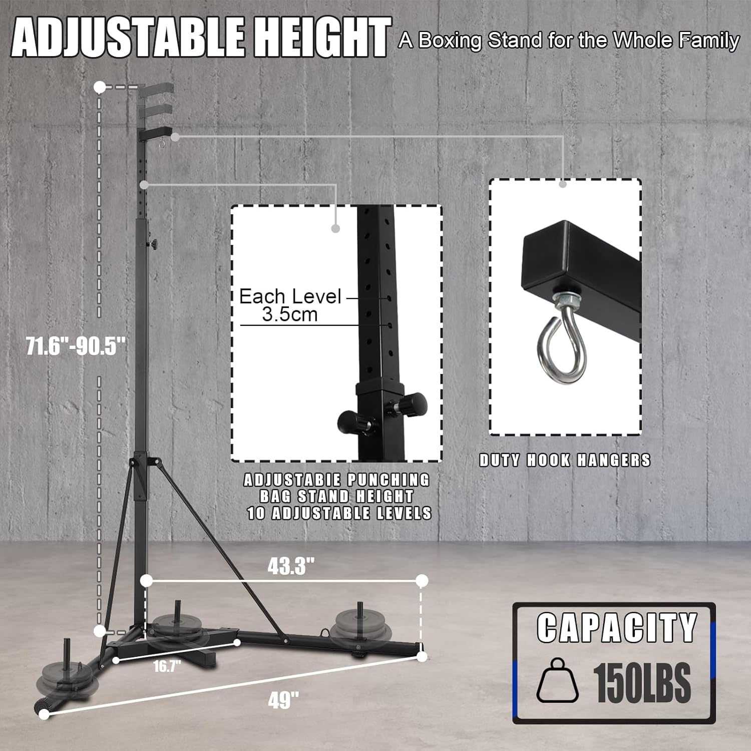 ✅Adjustable Height-The height of our heavy bag stands can be easily adjusted from 182cm/71.6inch to 230cm/90.5inch. Suitable for people of different height and training needs.No punching bag included,please buy it separately