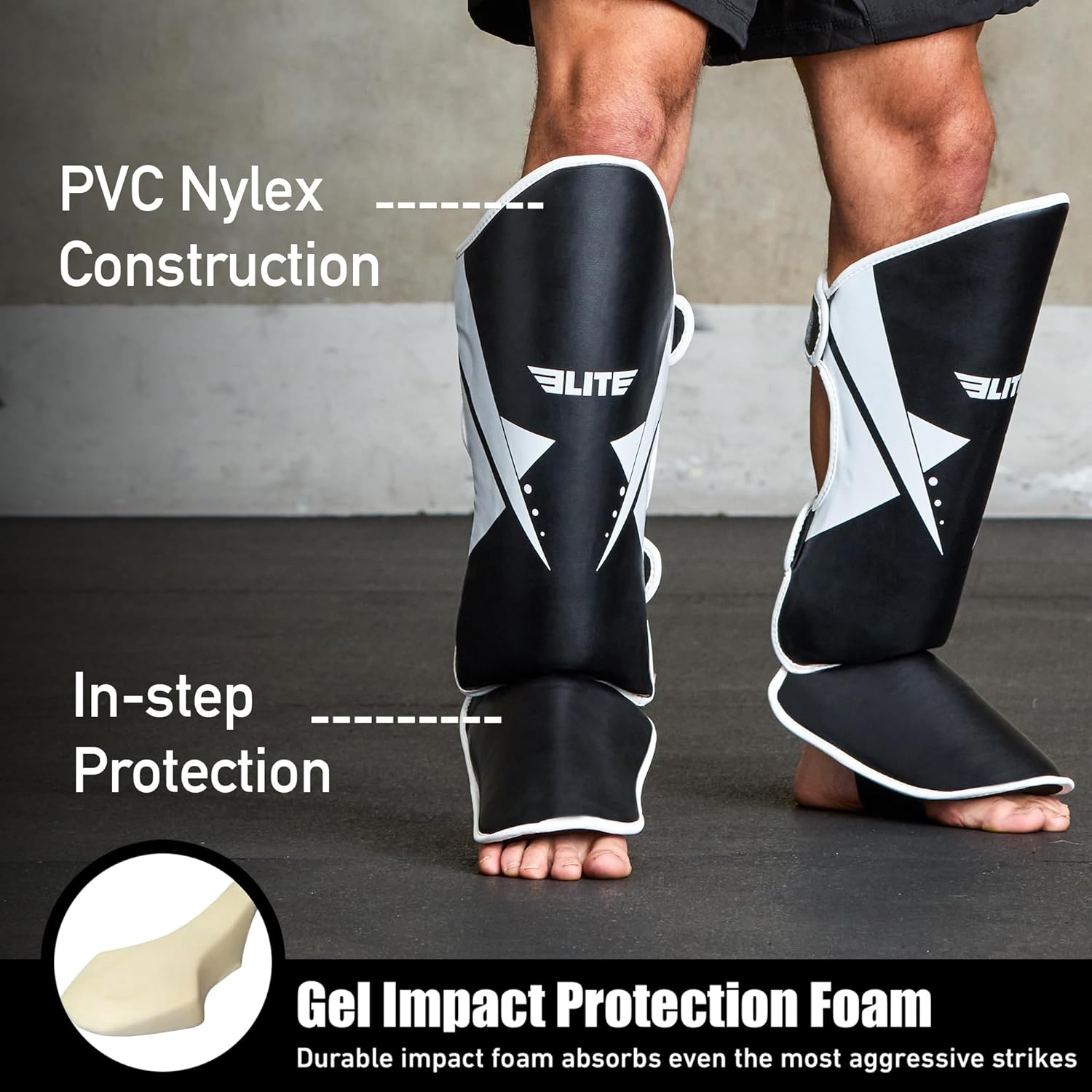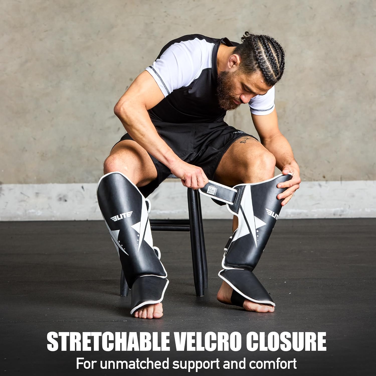 ✅ Construction – Elite Sports Muay Thai shin guards are premium quality shin guards that are built to protect and last long. These kickboxing shin guards have adjustable straps at top and calves and a foot strap to keep these MMA leg guards in place.