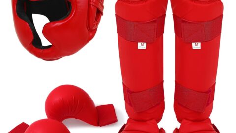 5 Pcs Red Sparring Gear Set 1 Pcs Boxing Headgear Safety Helmet 2 Pcs Karate Gloves 2 Pcs Karate Shin Guards and Karate Shoes Boxing Gear Equipment for Beginner Kid Adult Protective Training